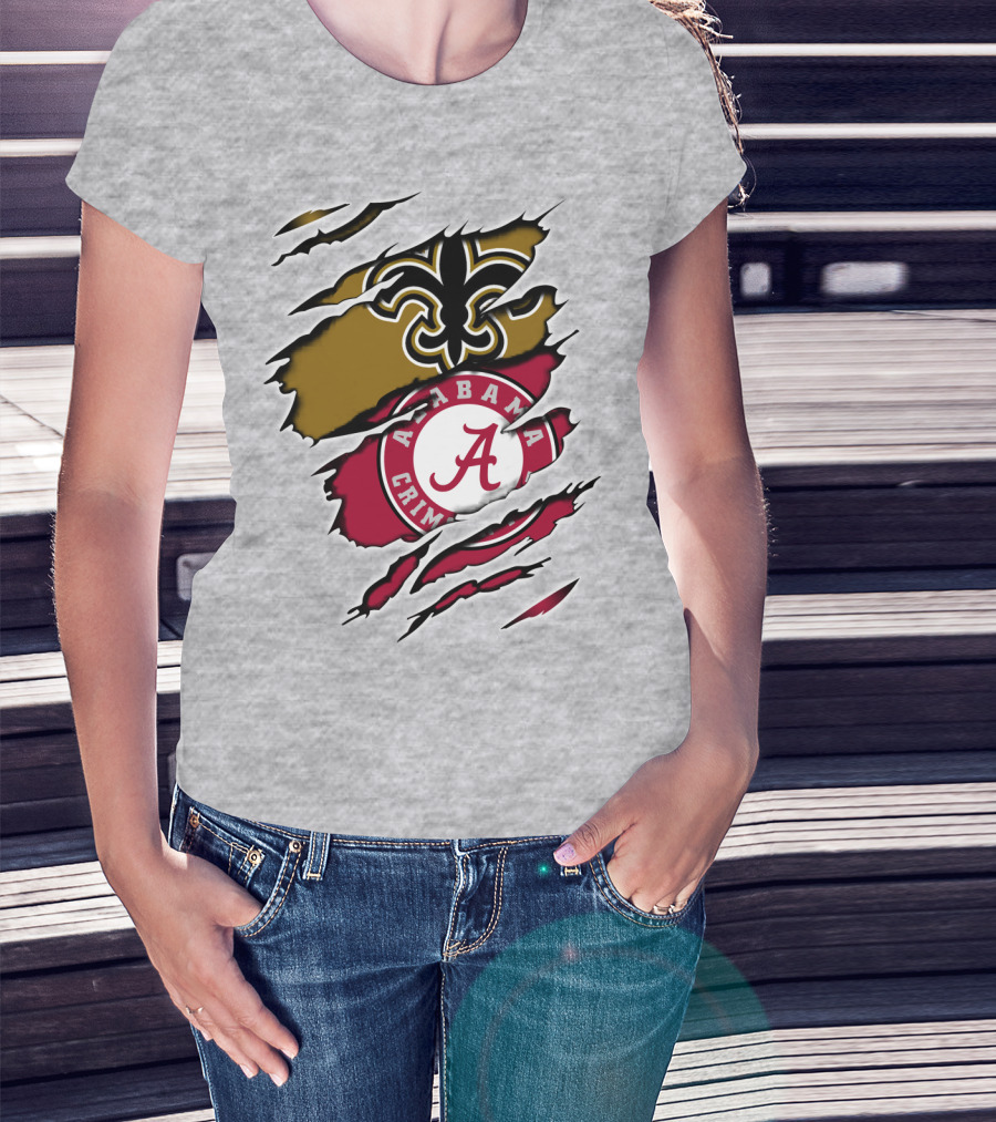 The Alabama Crimson Tide New Orleans Saints Fleur-de-Lis Claw Marks T-shirt is designed for everyday wear and a consistent fit. Fabric is pre-shrunk ring-spun cotton with durable stitching. See the size chart below for exact measurements.