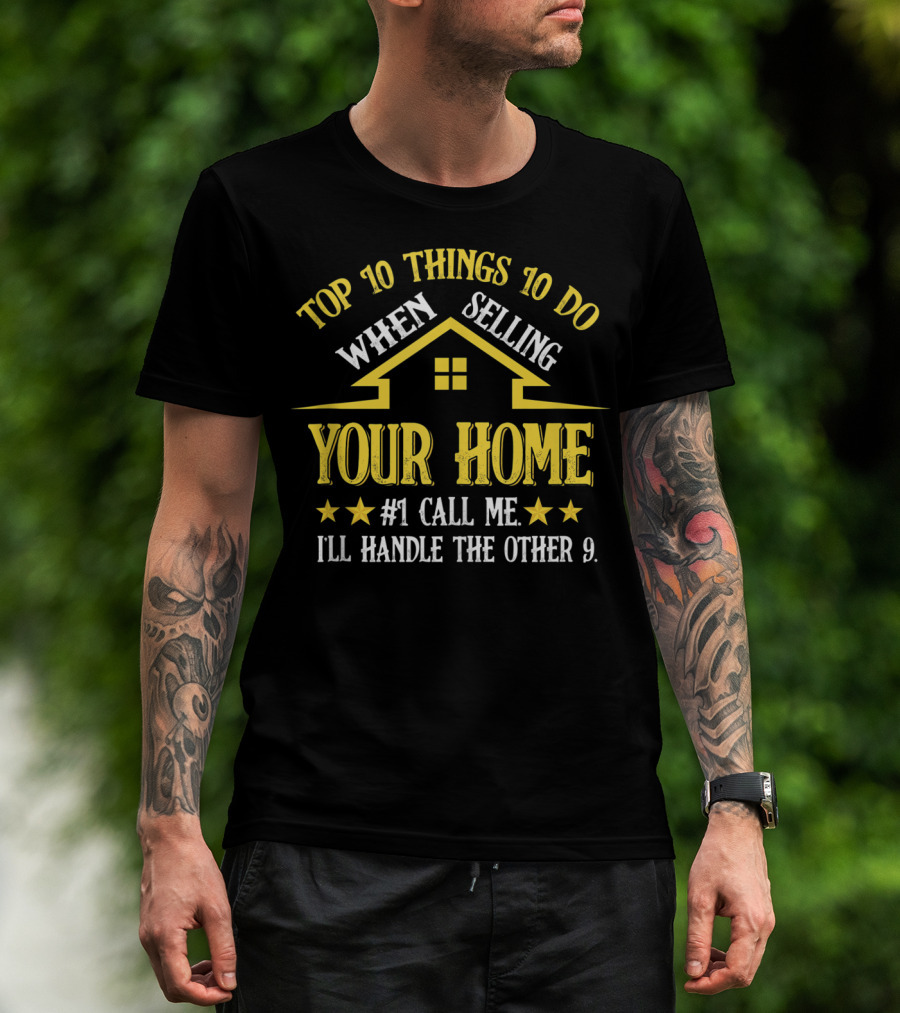 The TOP 10 THINGS TO DO WHEN SELLING YOUR HOME #1 CALL ME I'LL HANDLE THE OTHER 9 T-shirt is designed for everyday wear and a consistent fit. Fabric is pre-shrunk ring-spun cotton with durable stitching. See the size chart below for exact measurements.