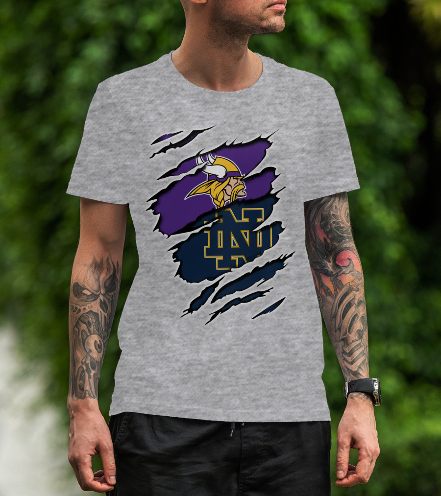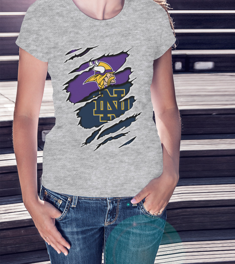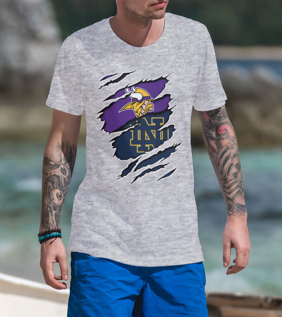 The Vikings Notredame Logo Fusion T-shirt is designed for everyday wear and a consistent fit. Fabric is pre-shrunk ring-spun cotton with durable stitching. See the size chart below for exact measurements.
