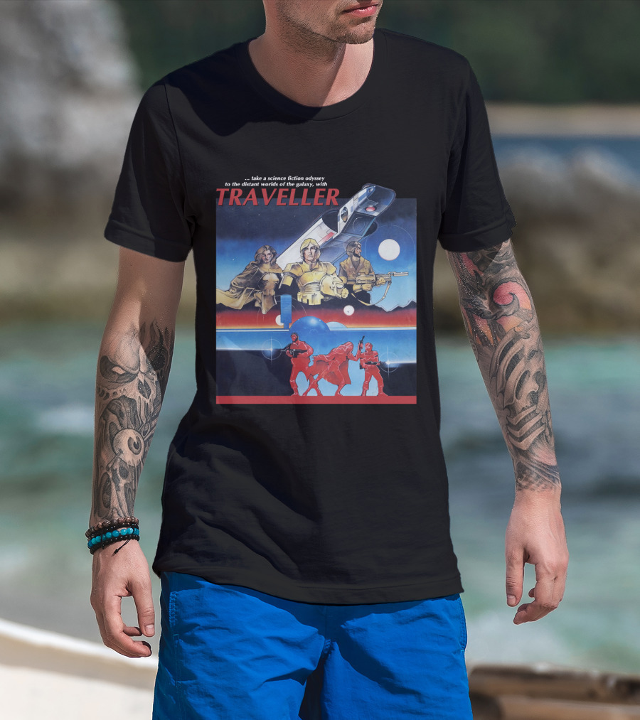 The Traveller Science Fiction Odyssey to the Distant Worlds of the Galaxy T-shirt is designed for everyday wear and a consistent fit. Fabric is pre-shrunk ring-spun cotton with durable stitching. See the size chart below for exact measurements.