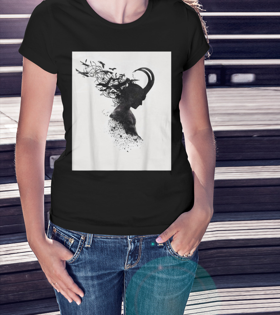 Loki Norse God Of Mischief Silhouette With Birds And Horns T-Shirt