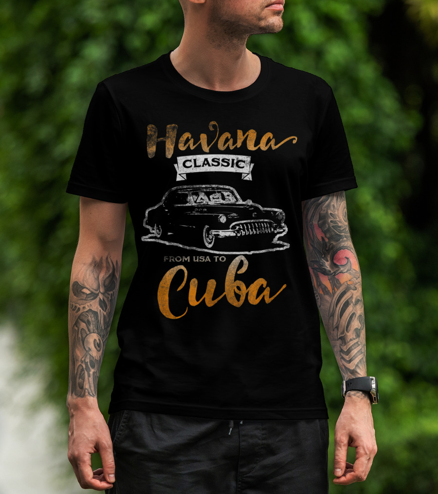 The Havana Classic Car From USA to Cuba T-shirt is designed for everyday wear and a consistent fit. Fabric is pre-shrunk ring-spun cotton with durable stitching. See the size chart below for exact measurements.