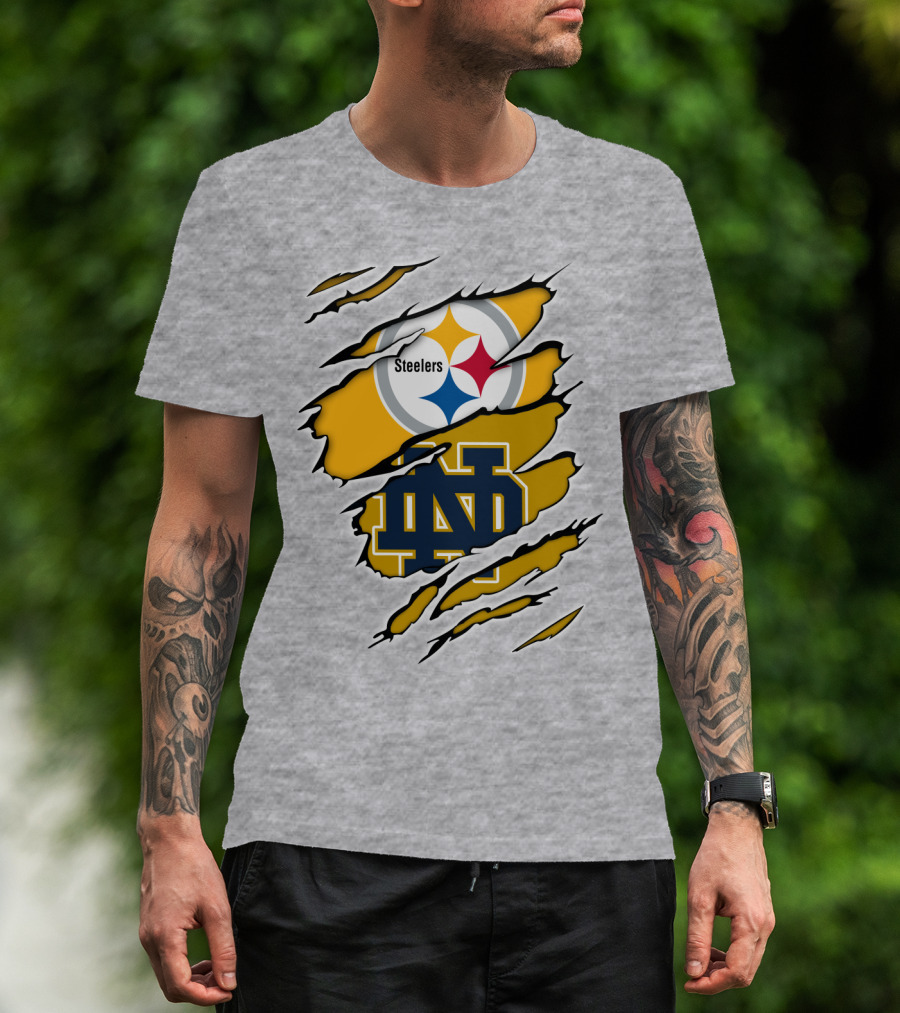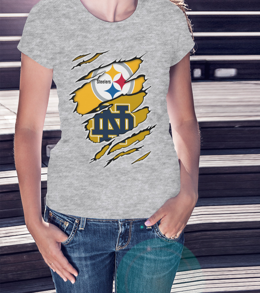 The Steelers Notre Dame Logo Ripped T-shirt is designed for everyday wear and a consistent fit. Fabric is pre-shrunk ring-spun cotton with durable stitching. See the size chart below for exact measurements.