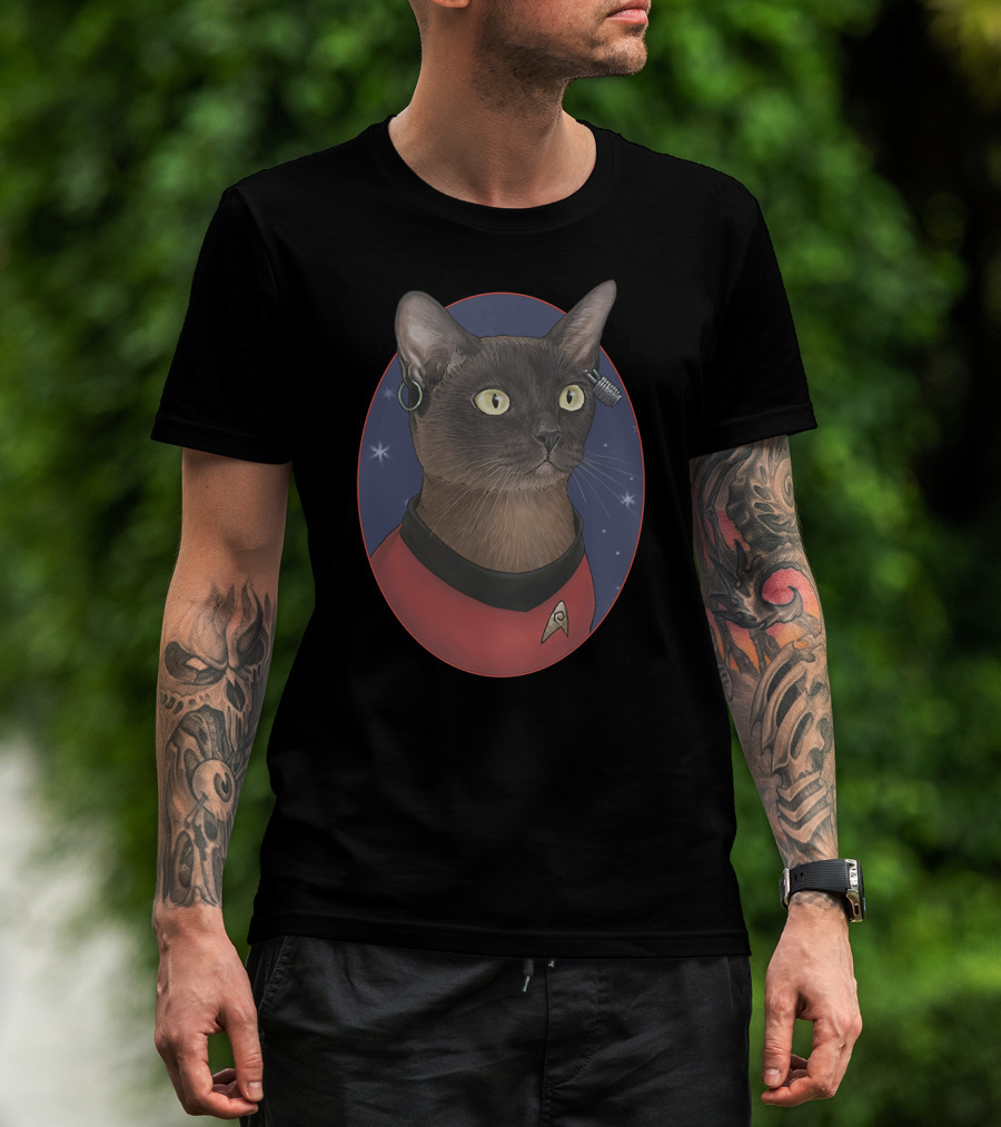 Star Trek Uhura Cat Badge In Space Oval With Earrings And Red Uniform T-Shirt