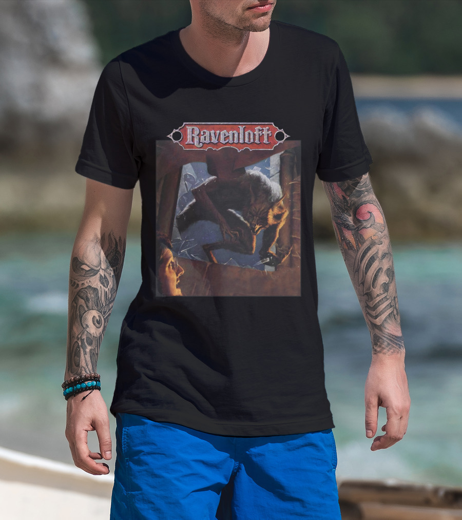 The Ravenloft Dark of the Moon Wolf and Person in Broken Window Scene T-shirt is designed for everyday wear and a consistent fit. Fabric is pre-shrunk ring-spun cotton with durable stitching. See the size chart below for exact measurements.