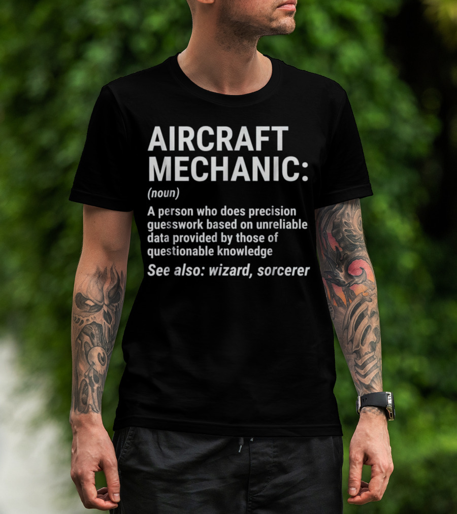 The Aircraft Mechanic Funny Definition Precision Guesswork Wizard Sorcerer T-shirt is designed for everyday wear and a consistent fit. Fabric is pre-shrunk ring-spun cotton with durable stitching. See the size chart below for exact measurements.
