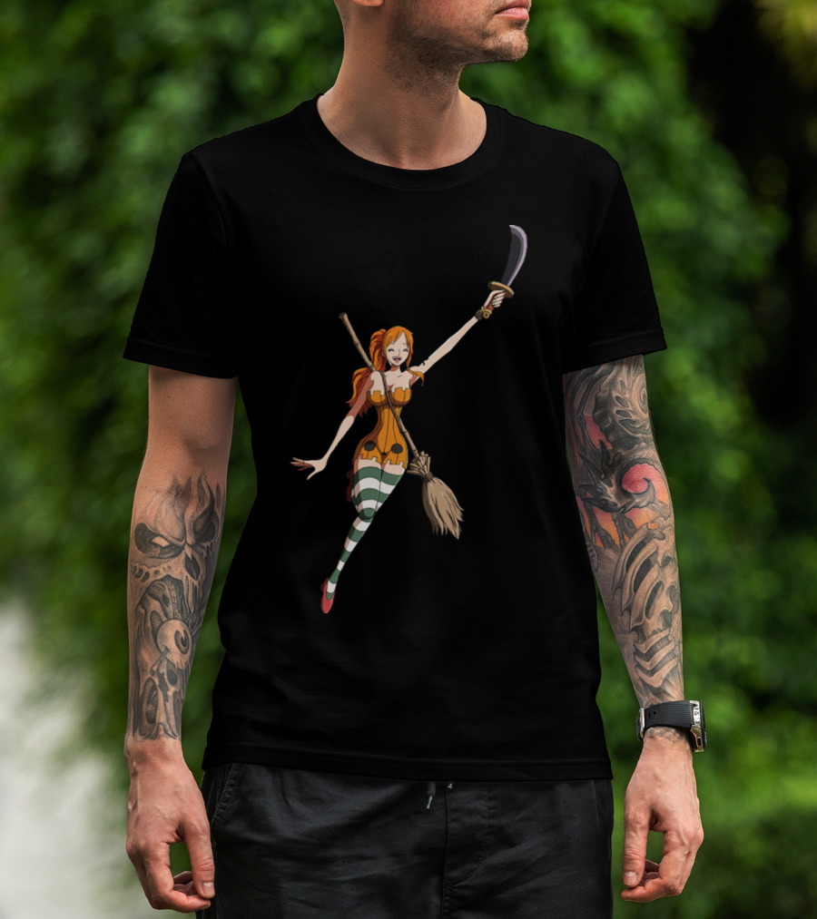 The Nami Witch Riding Broomstick Sword Striped Stockings T-shirt is designed for everyday wear and a consistent fit. Fabric is pre-shrunk ring-spun cotton with durable stitching. See the size chart below for exact measurements.