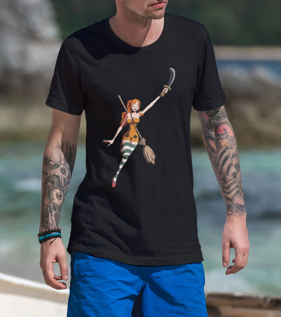 Nami Witch Riding Broomstick Sword Striped Stockings T-Shirt