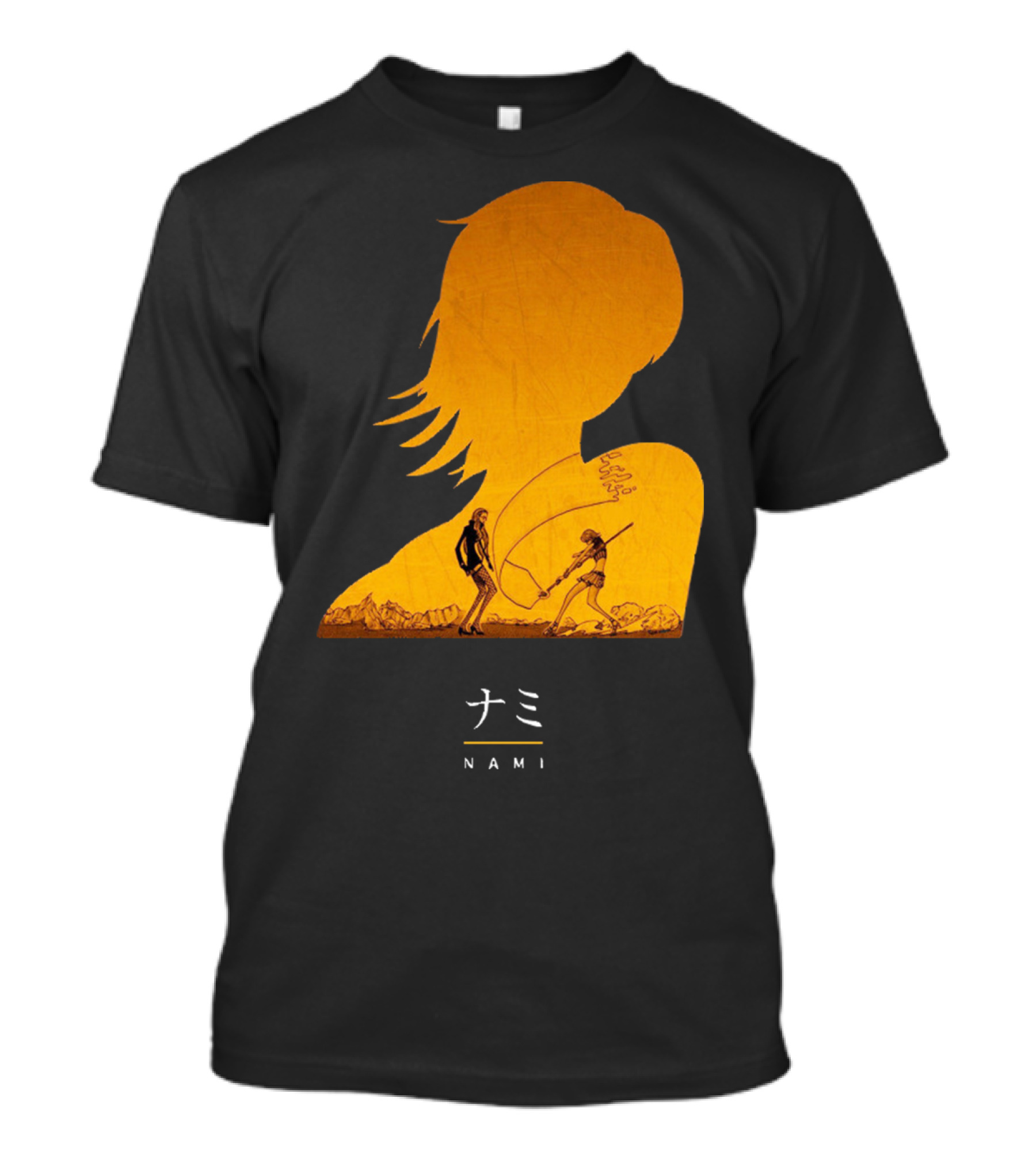 The One Piece Nami Silhouette with Luffy and Nami Scene T-shirt is designed for everyday wear and a consistent fit. Fabric is pre-shrunk ring-spun cotton with durable stitching. See the size chart below for exact measurements.