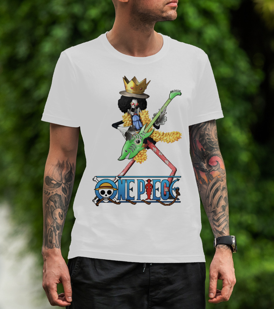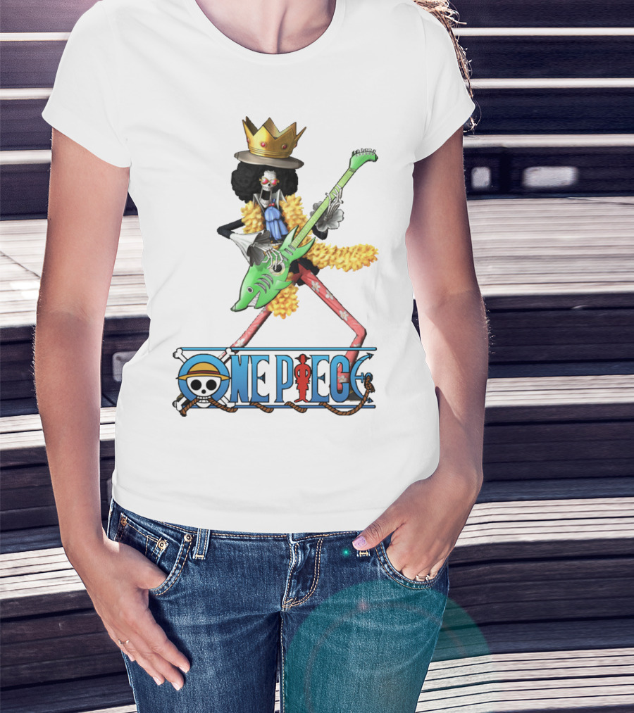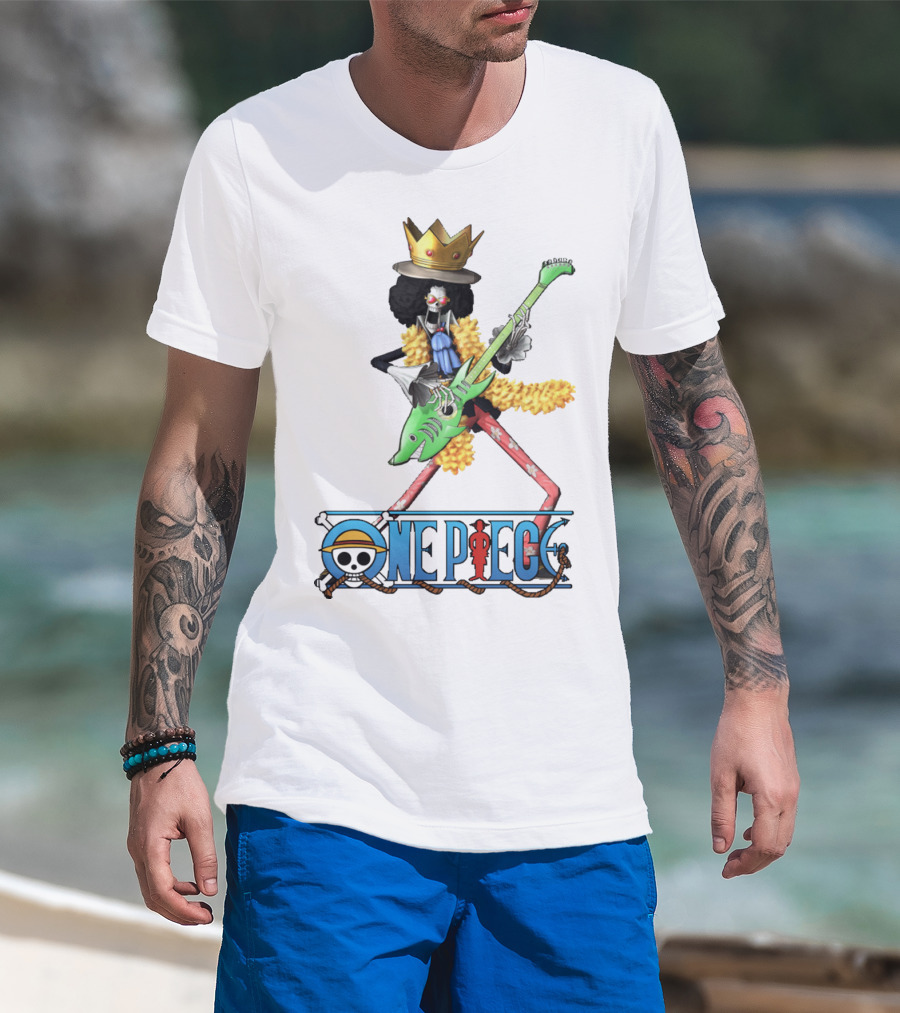 One Piece Brook Playing Guitar With Crown And Yellow Feather Boa T-Shirt