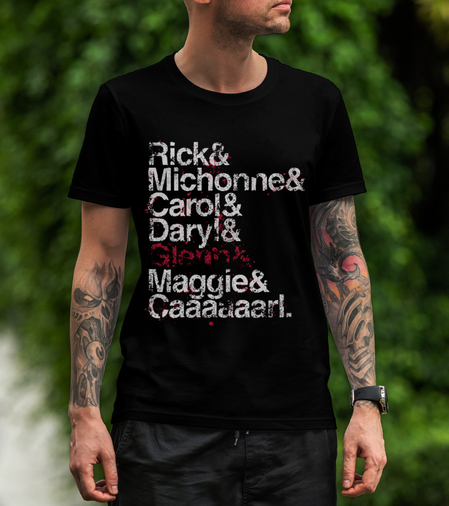The Rick and Michonne and Carol and Daryl and Maggie and Caaaaarl Spoiler Version T-shirt is designed for everyday wear and a consistent fit. Fabric is pre-shrunk ring-spun cotton with durable stitching. See the size chart below for exact measurements.