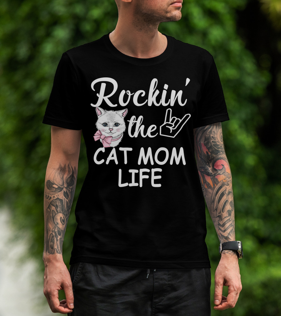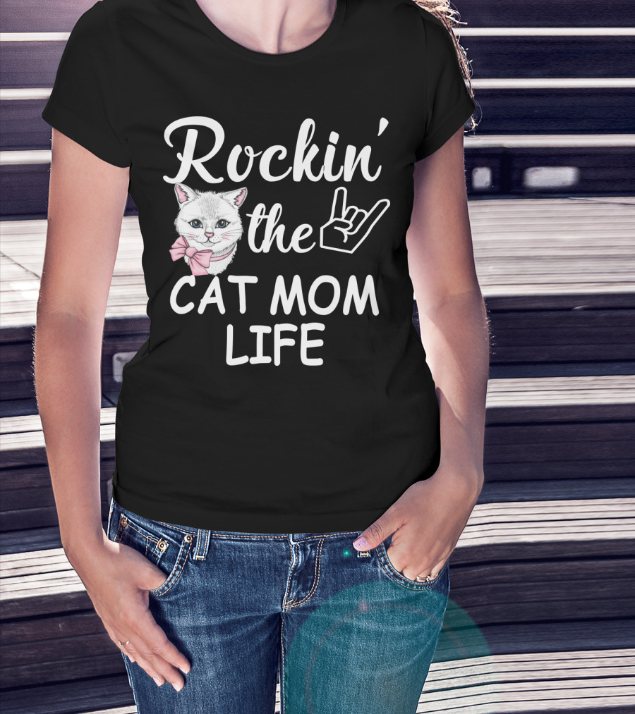Rockin' The Cat Mom Life With Rock Hand And Pink Bow Cat T-Shirt