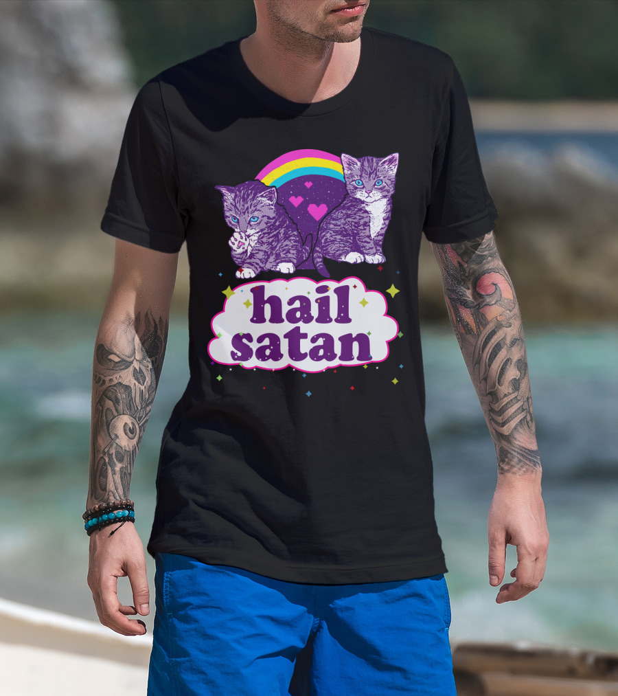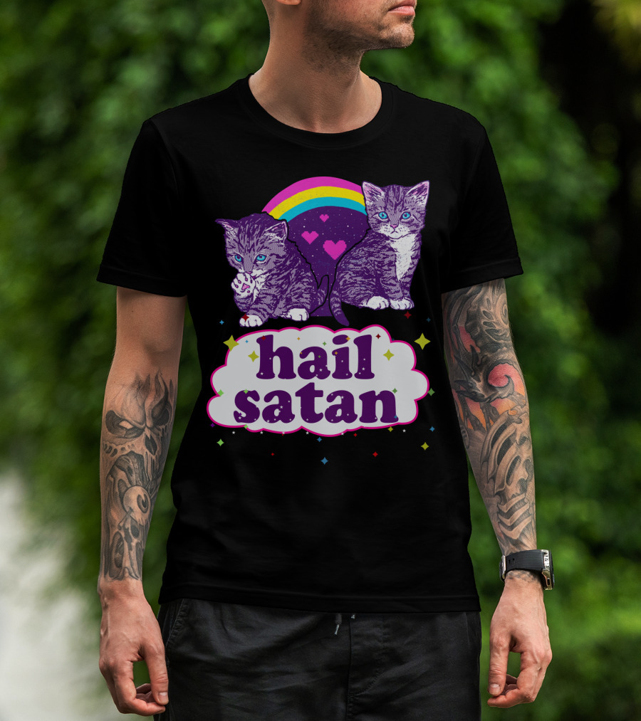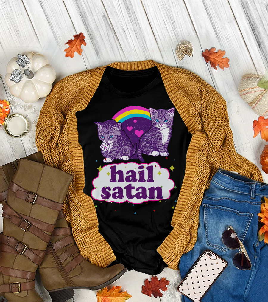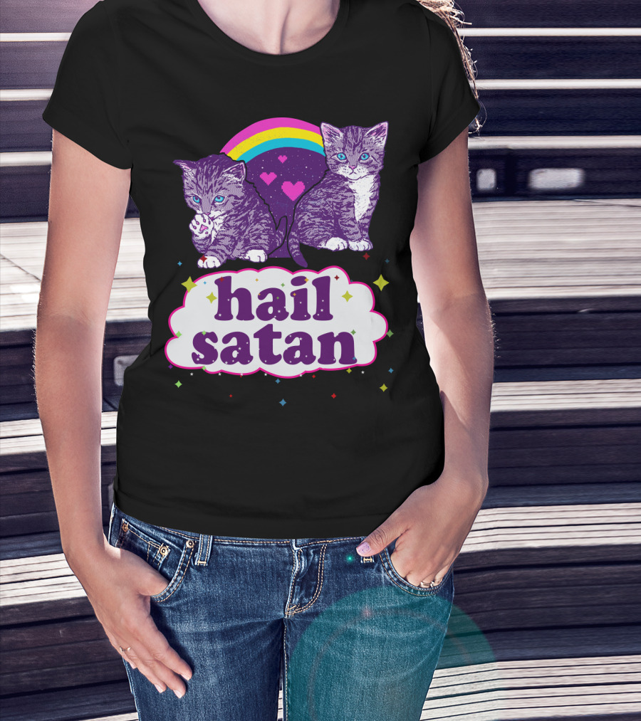 Hail Satan Cats With Rainbow And Hearts T-Shirt