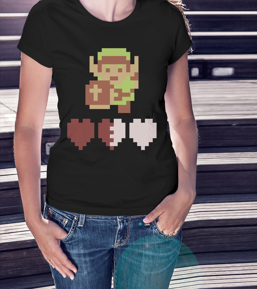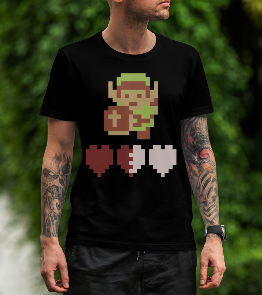 The The Legend of Zelda Link Pixel Art with Heart Containers T-shirt is designed for everyday wear and a consistent fit. Fabric is pre-shrunk ring-spun cotton with durable stitching. See the size chart below for exact measurements.
