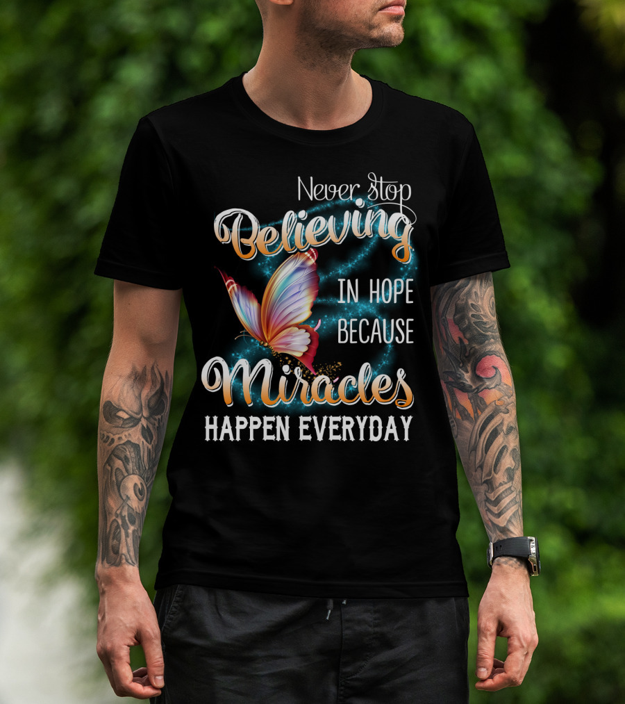 The Never Stop Believing in Hope Because Miracles Happen Everyday Butterfly T-shirt is designed for everyday wear and a consistent fit. Fabric is pre-shrunk ring-spun cotton with durable stitching. See the size chart below for exact measurements.