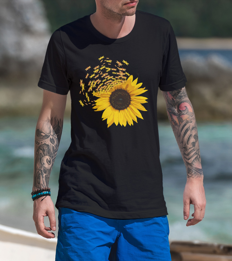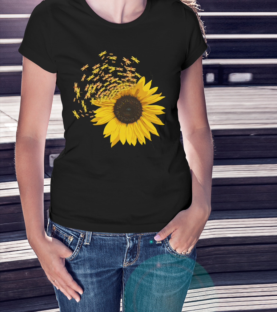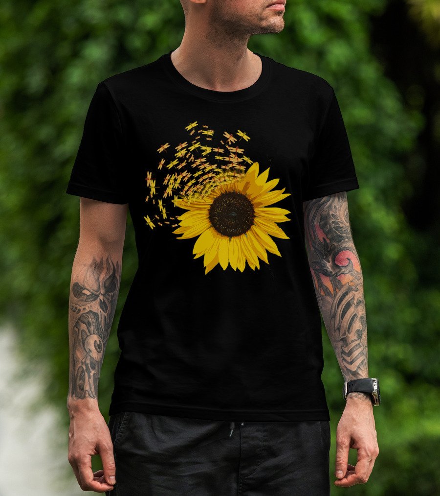 The Sunflower Burst with Dragonflies Spiral T-shirt is designed for everyday wear and a consistent fit. Fabric is pre-shrunk ring-spun cotton with durable stitching. See the size chart below for exact measurements.
