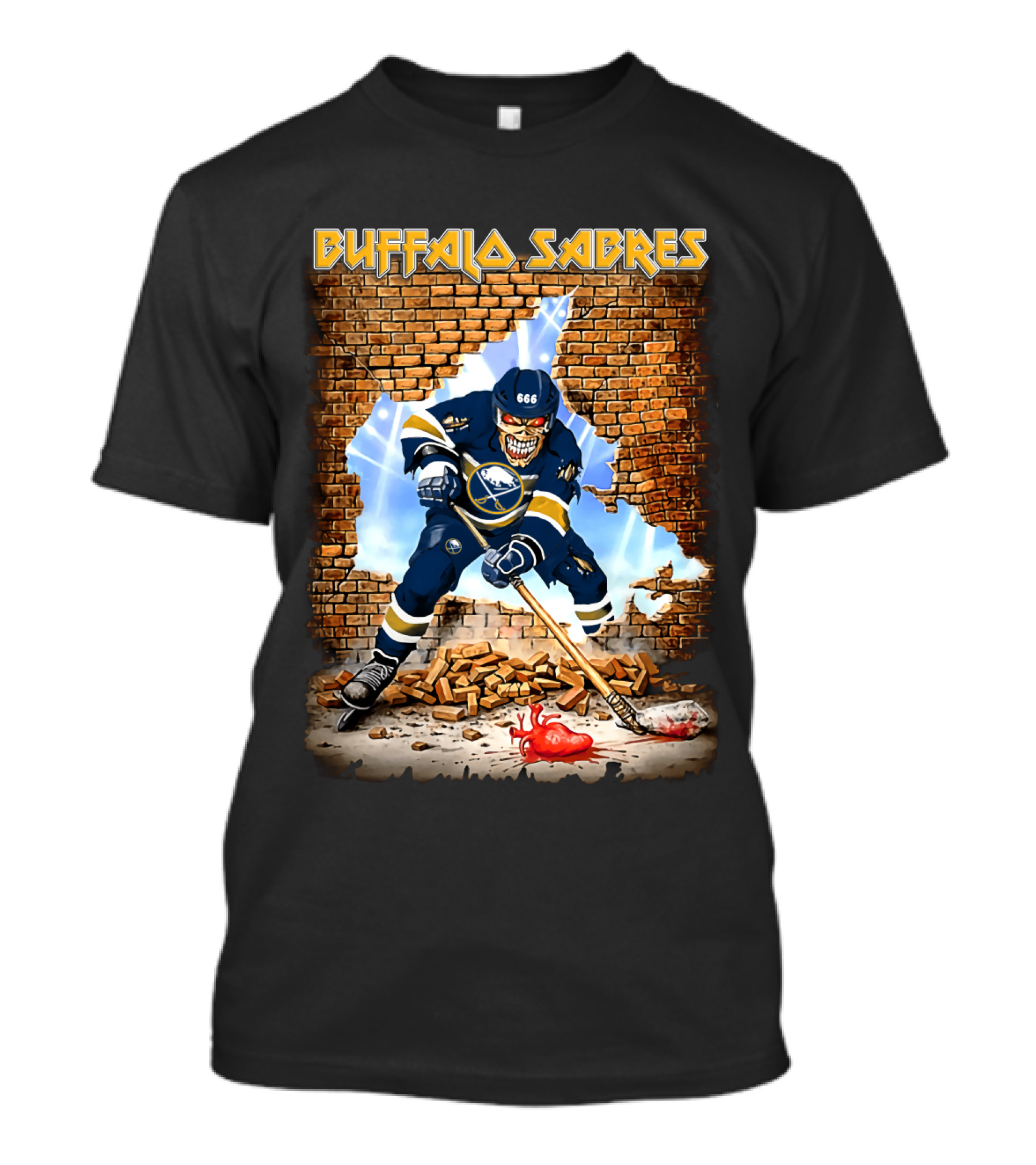 The Buffalo Sabres Hockey Player Breaking Through Brick Wall T-shirt is designed for everyday wear and a consistent fit. Fabric is pre-shrunk ring-spun cotton with durable stitching. See the size chart below for exact measurements.