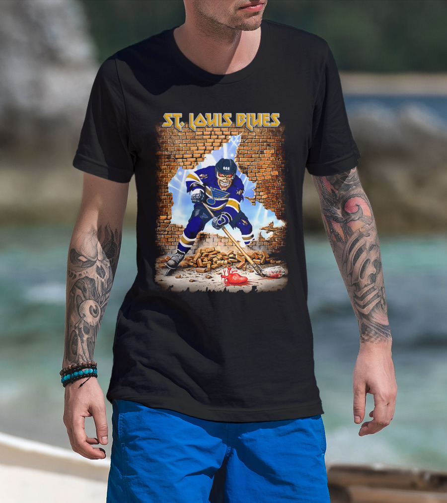 The St. Louis Blues Hockey Skeleton Breaking Through Wall T-shirt is designed for everyday wear and a consistent fit. Fabric is pre-shrunk ring-spun cotton with durable stitching. See the size chart below for exact measurements.