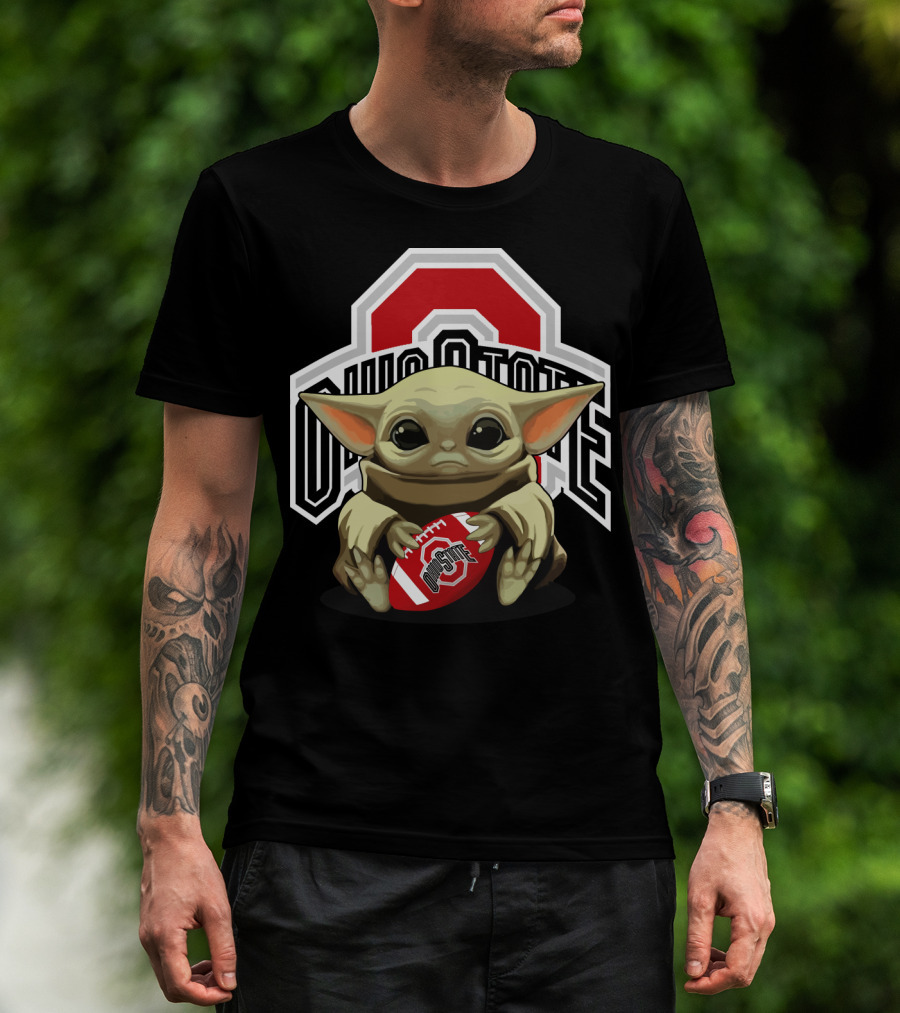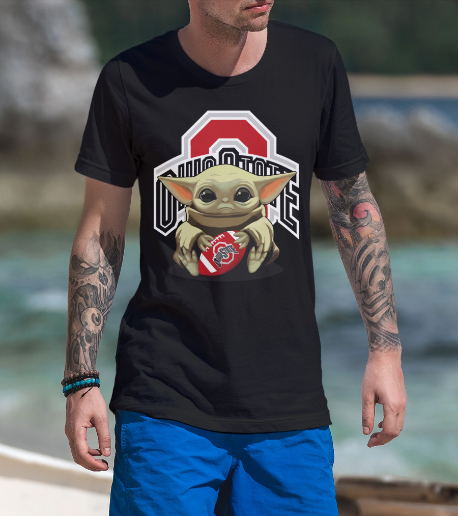The Ohio State Baby Yoda Football T-shirt is designed for everyday wear and a consistent fit. Fabric is pre-shrunk ring-spun cotton with durable stitching. See the size chart below for exact measurements.