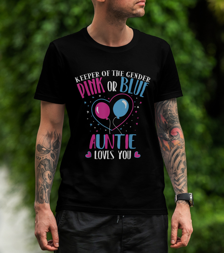 Keeper Of The Gender Pink Or Blue Auntie Loves You Balloons Heart Stars T-Shirt