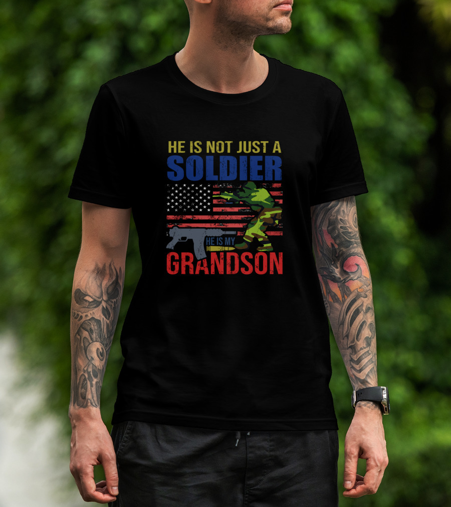 The He Is Not Just a Soldier He Is My Grandson American Flag Camouflage T-shirt is designed for everyday wear and a consistent fit. Fabric is pre-shrunk ring-spun cotton with durable stitching. See the size chart below for exact measurements.