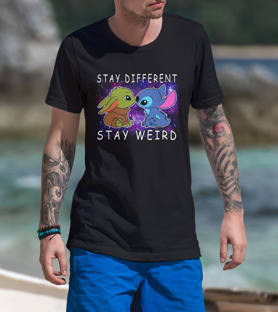 Stay Different Stay Weird Baby Yoda And Stitch Space Background T-Shirt