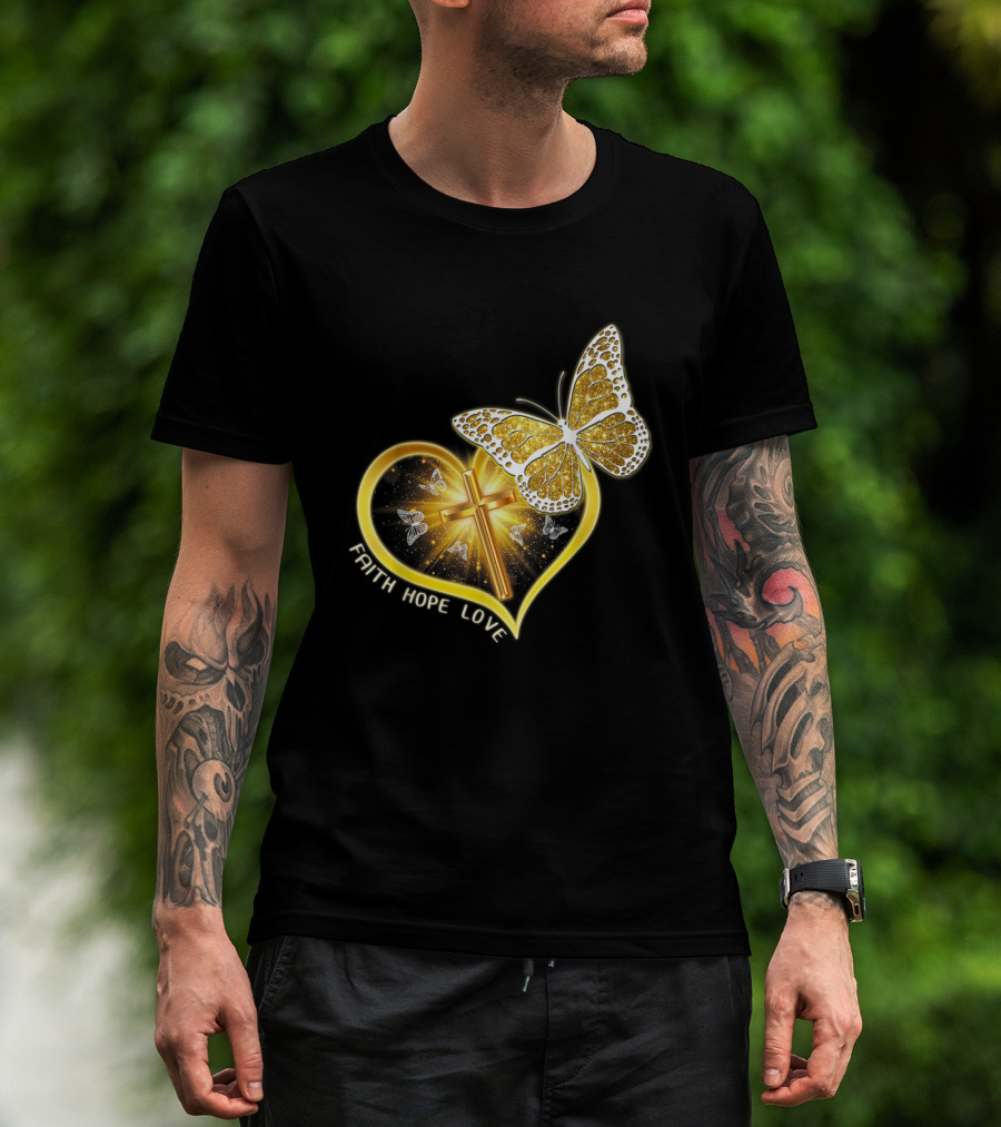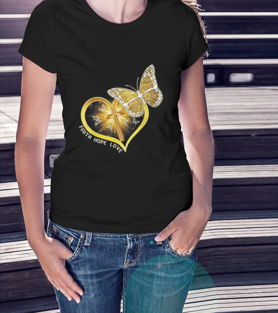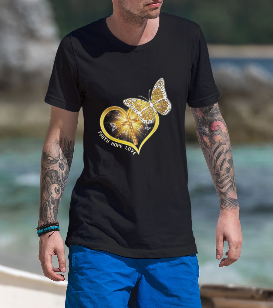 Faith Hope Love Butterfly Heart Christian Cross Jesus T-Shirt