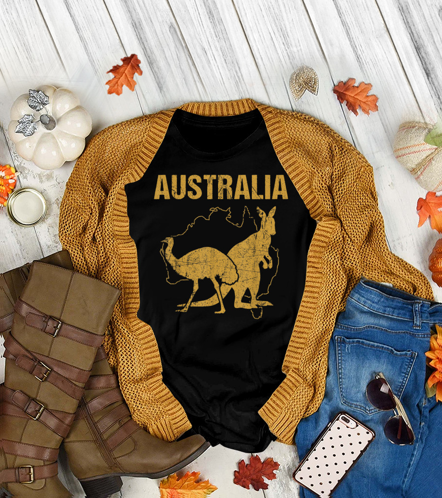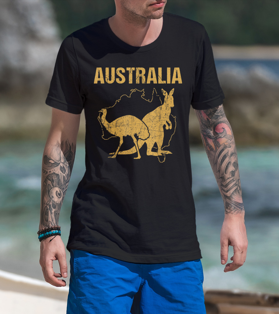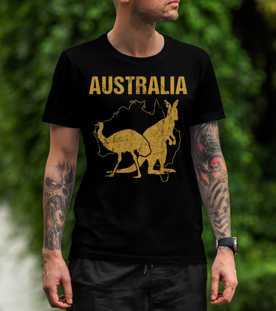 The Australia Kangaroo and Emu Silhouette Map T-shirt is designed for everyday wear and a consistent fit. Fabric is pre-shrunk ring-spun cotton with durable stitching. See the size chart below for exact measurements.