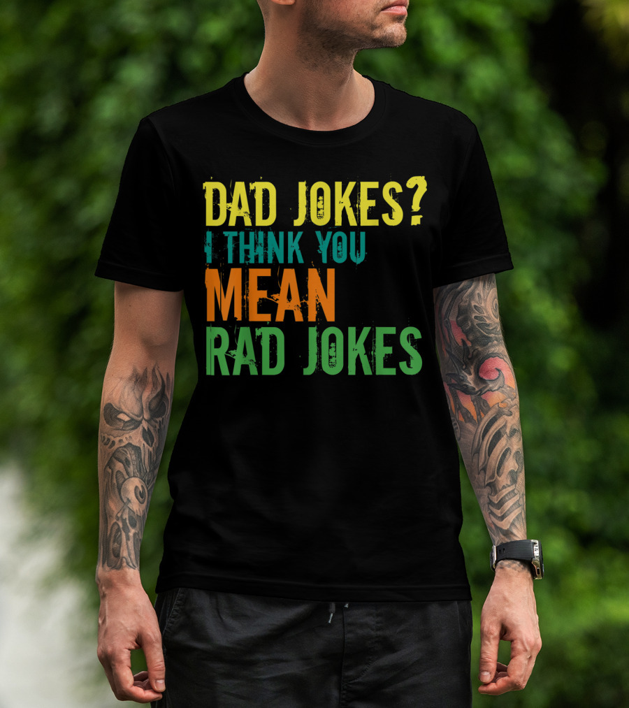 The Dad Jokes I Think You Mean Rad Jokes Father's T-shirt is designed for everyday wear and a consistent fit. Fabric is pre-shrunk ring-spun cotton with durable stitching. See the size chart below for exact measurements.