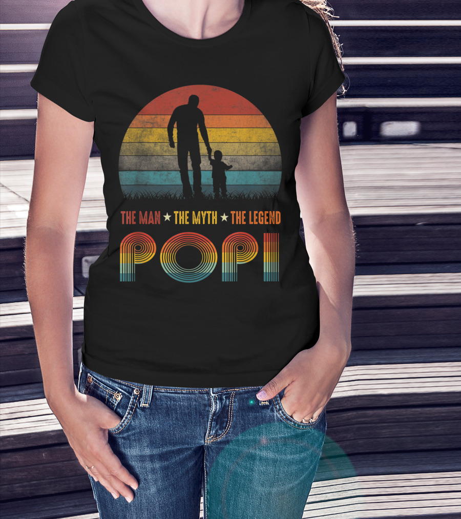 The Popi The Man The Myth The Legend Vintage Silhouette Retro Sunset T-shirt is designed for everyday wear and a consistent fit. Fabric is pre-shrunk ring-spun cotton with durable stitching. See the size chart below for exact measurements.