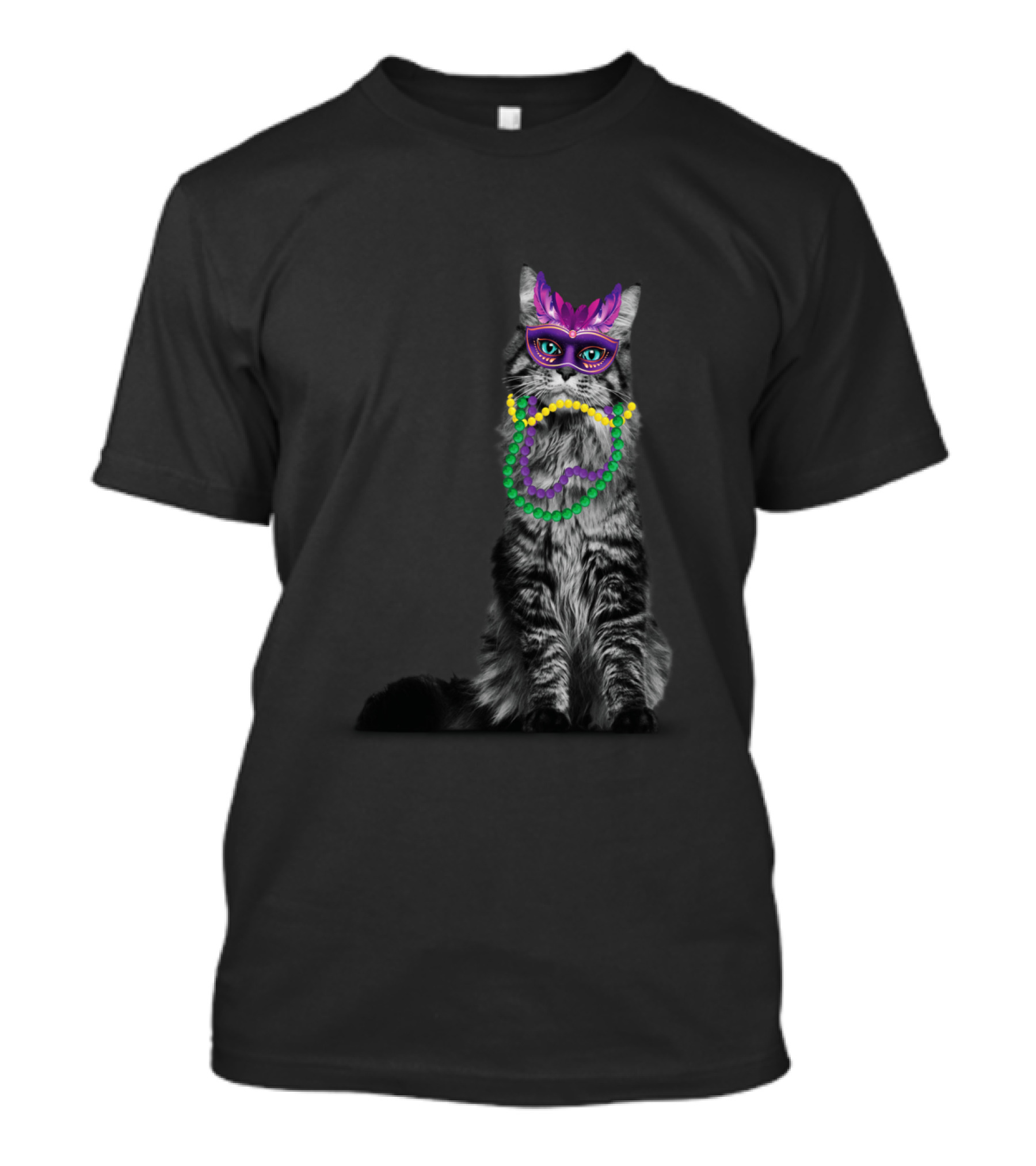 The Cat Beads with Mardi Gras Mask and Decorations T-shirt is designed for everyday wear and a consistent fit. Fabric is pre-shrunk ring-spun cotton with durable stitching. See the size chart below for exact measurements.