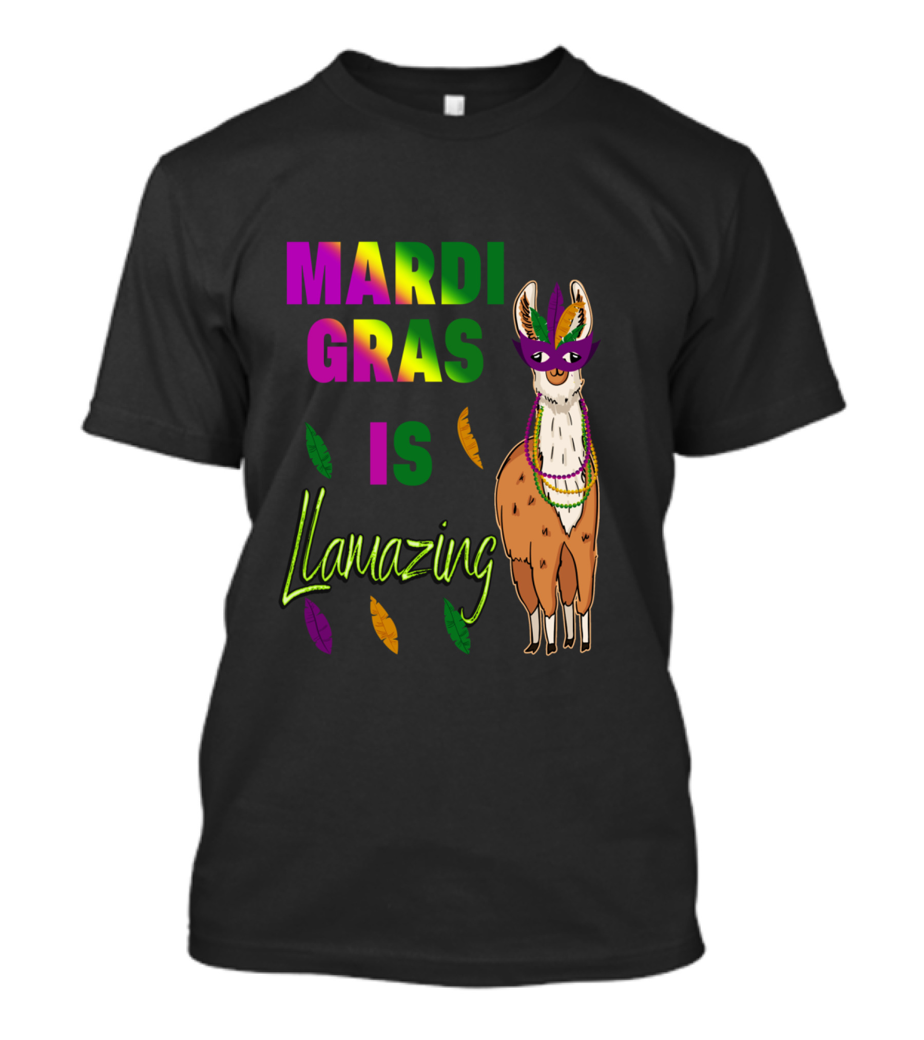 The Mardi Gras Is Llamazing Colorful Llama with Mask and Feathers T-shirt is designed for everyday wear and a consistent fit. Fabric is pre-shrunk ring-spun cotton with durable stitching. See the size chart below for exact measurements.