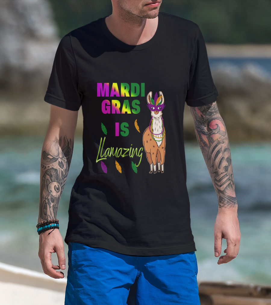 Mardi Gras Is Llamazing Colorful Llama With Mask And Feathers T-Shirt