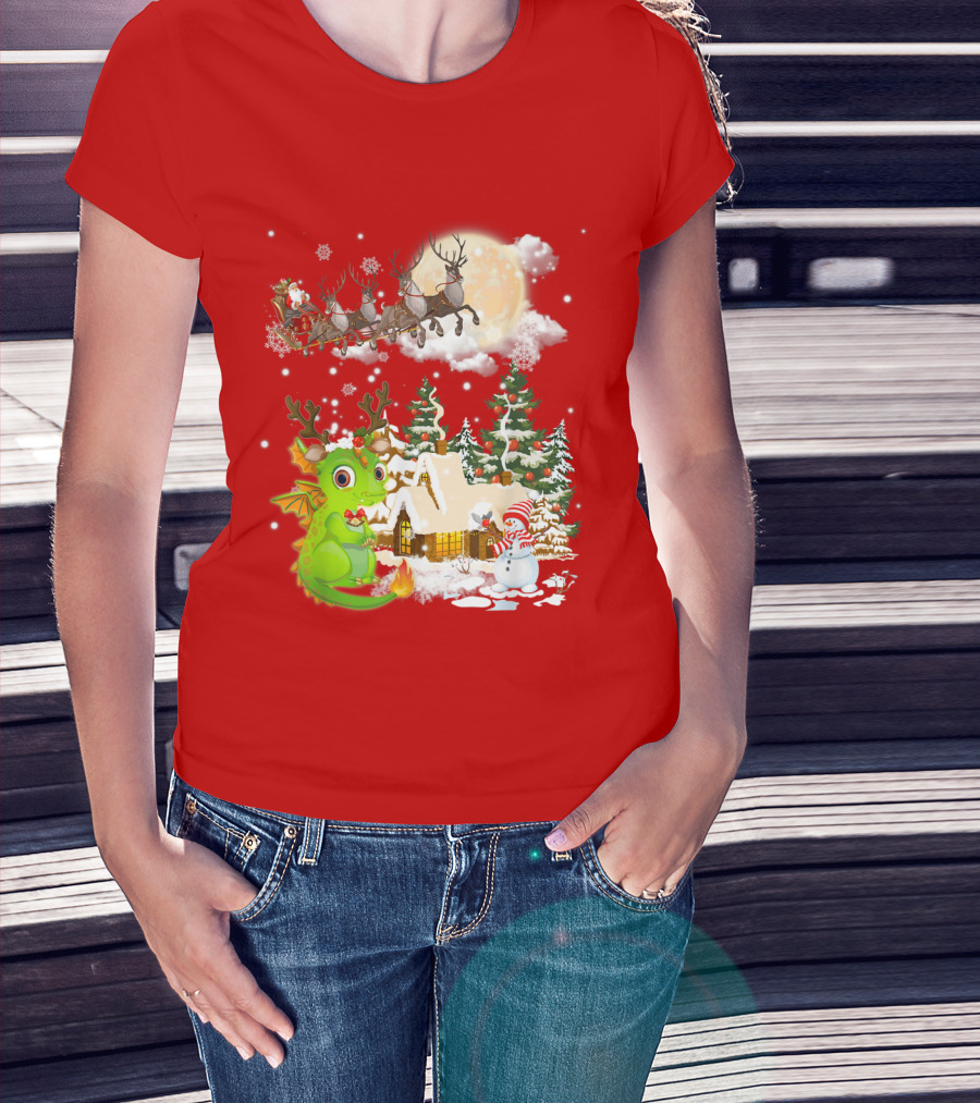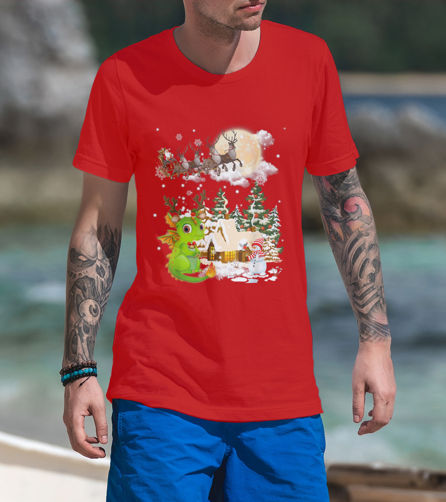 Santa's Sleigh Ride Over Snowy Village With Festive Dragon T-Shirt