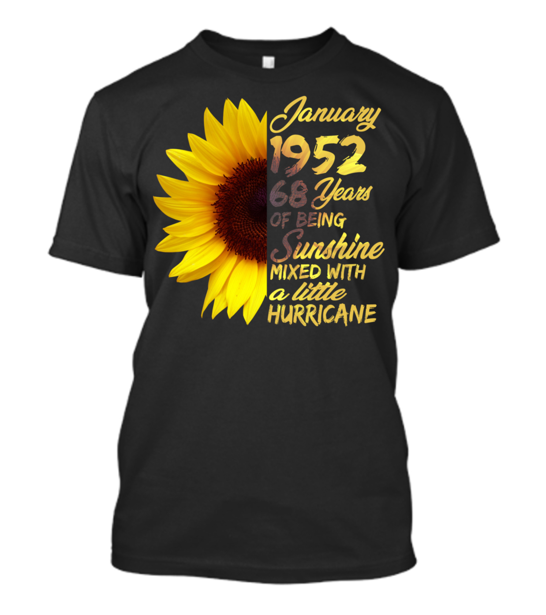 The January 1952 68 Years of Being Sunshine Mixed with a Little Hurricane T-shirt is designed for everyday wear and a consistent fit. Fabric is pre-shrunk ring-spun cotton with durable stitching. See the size chart below for exact measurements.