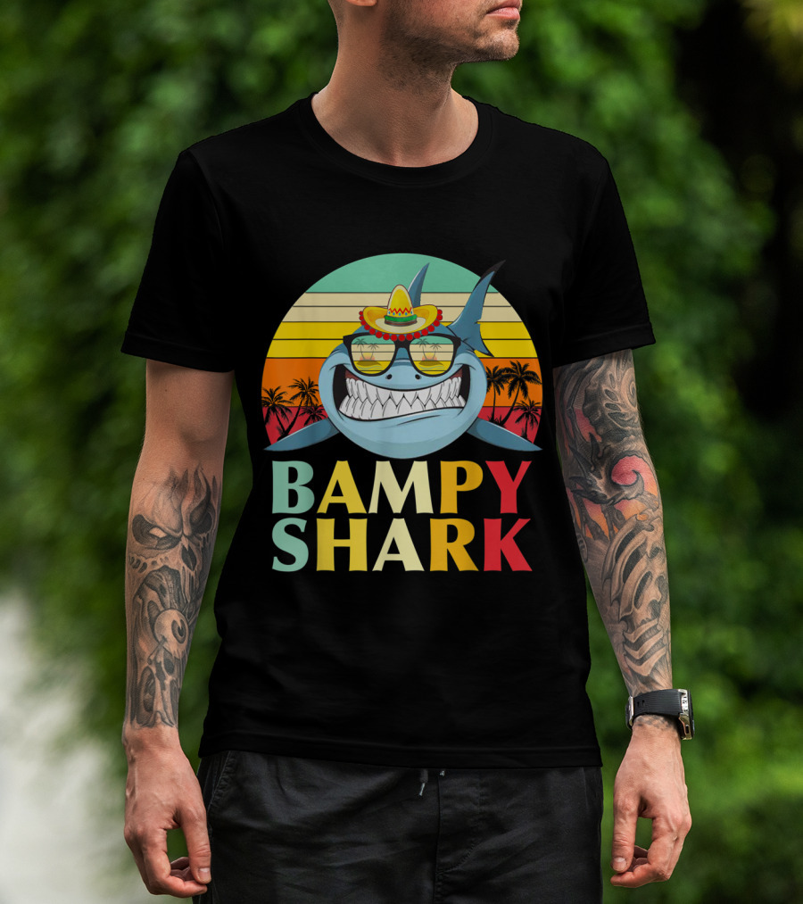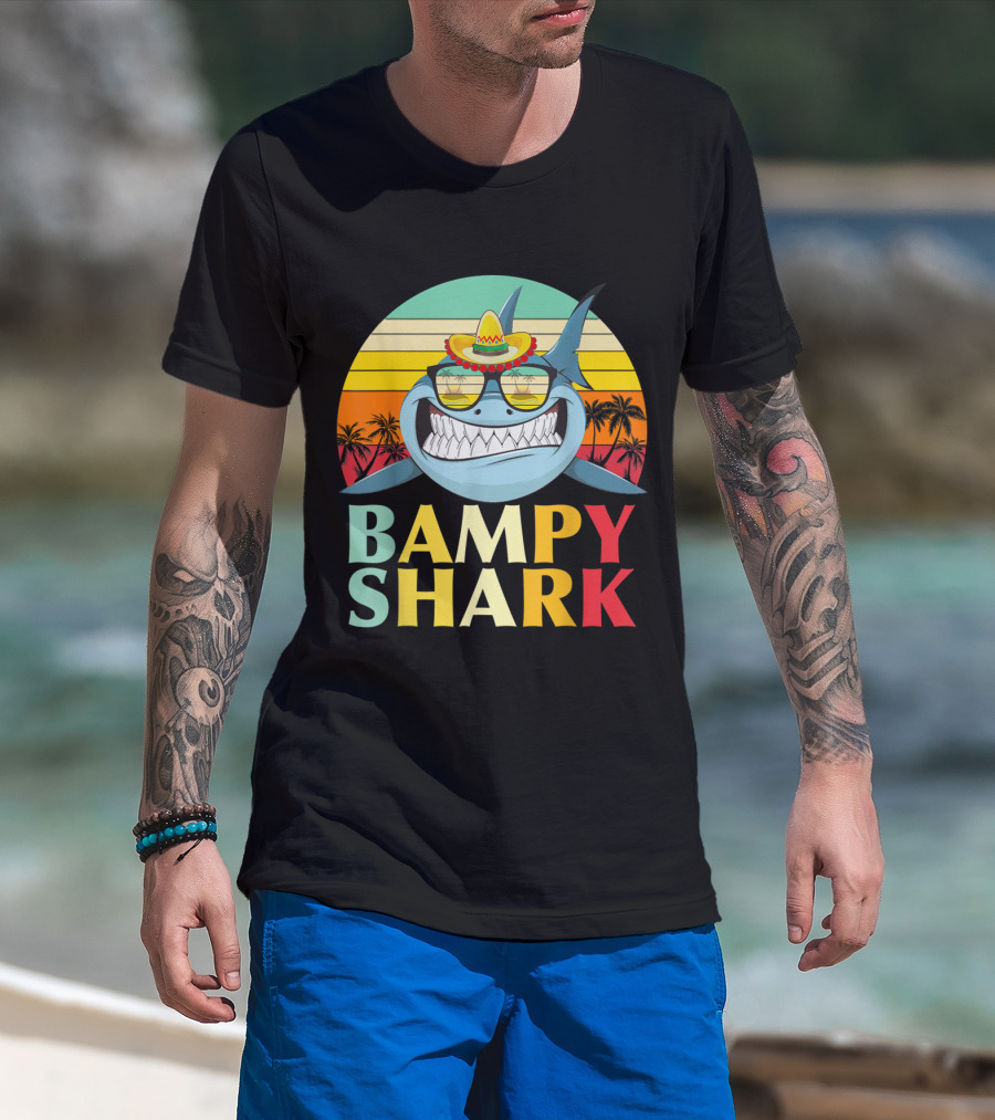 Bampy Shark Grandad From Grandchildren Shark With Sombrero And Sunglasses T-Shirt