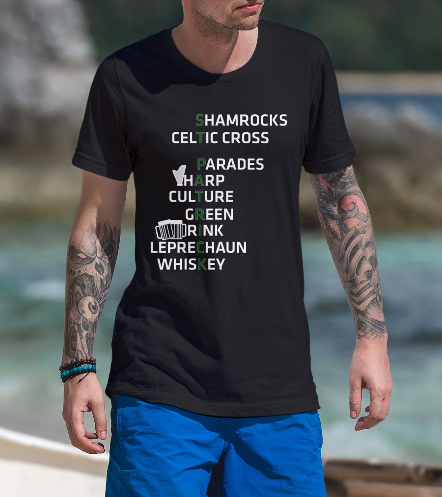 St Patrick Shamrocks Celtic Cross Parades Harp Culture Green Drink Leprechaun Whiskey T-Shirt