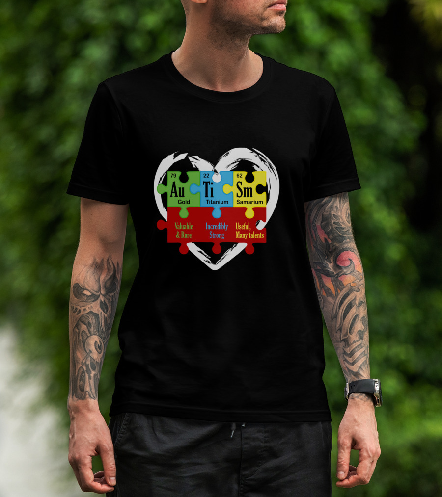The Autism Awareness Heart Puzzle Gold Titanium Samarium Valuable Rare Strong Talents T-shirt is designed for everyday wear and a consistent fit. Fabric is pre-shrunk ring-spun cotton with durable stitching. See the size chart below for exact measurements.