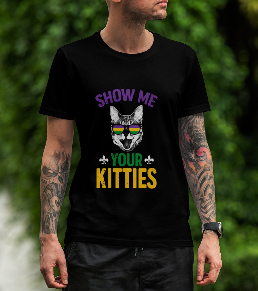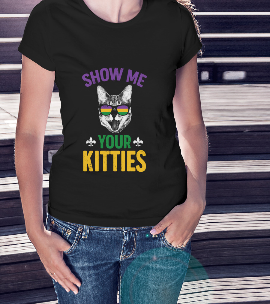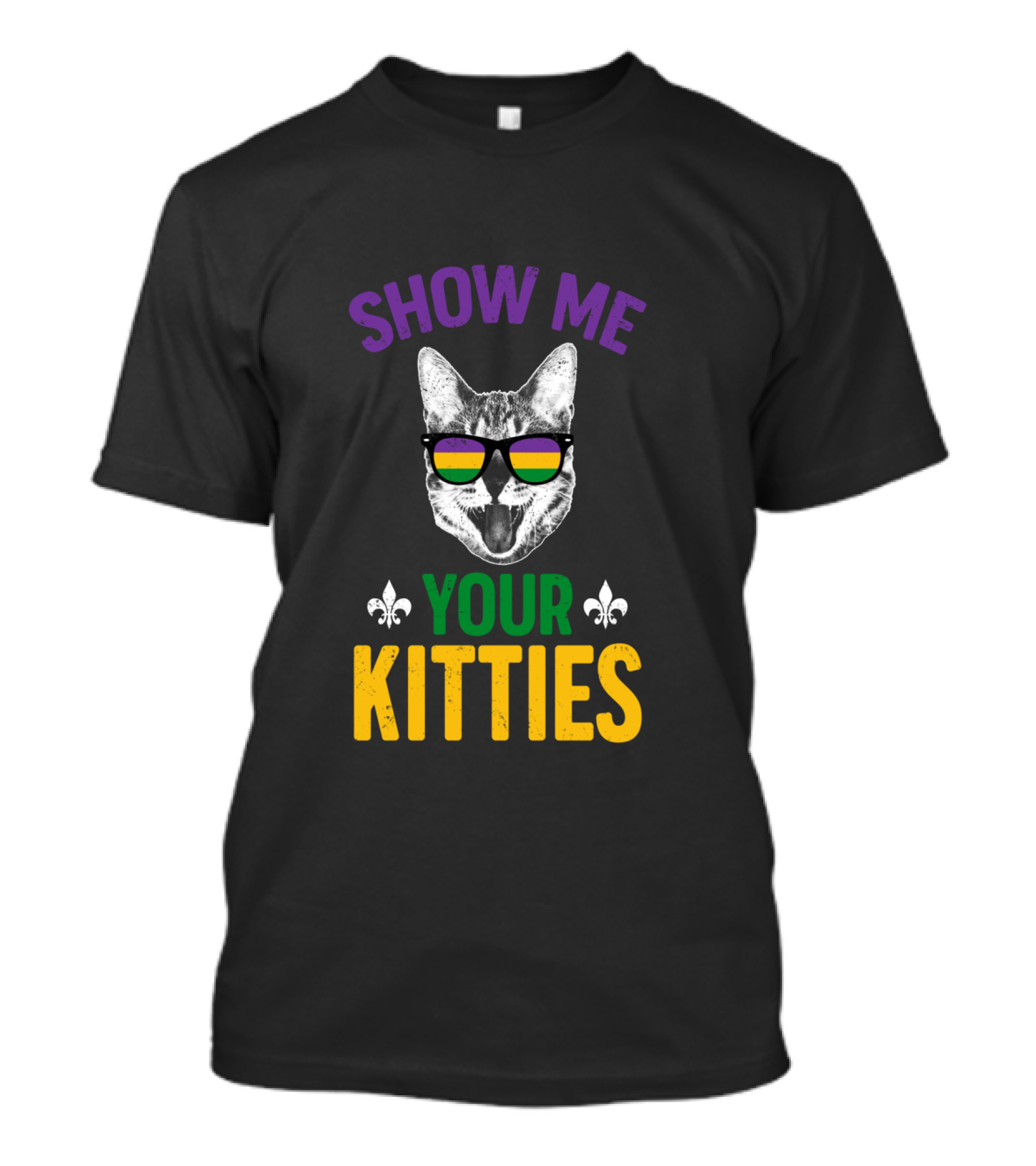 Show Me Your Kitties Cat With Sunglasses Mardi Gras Carnival Fleur-de-Lis T-Shirt