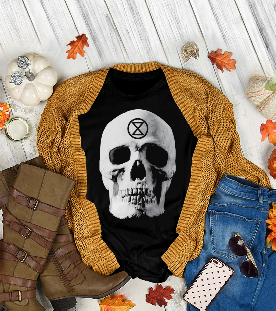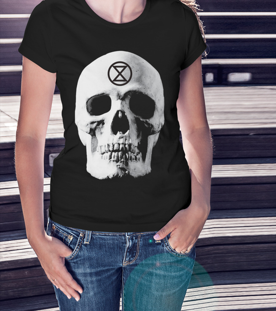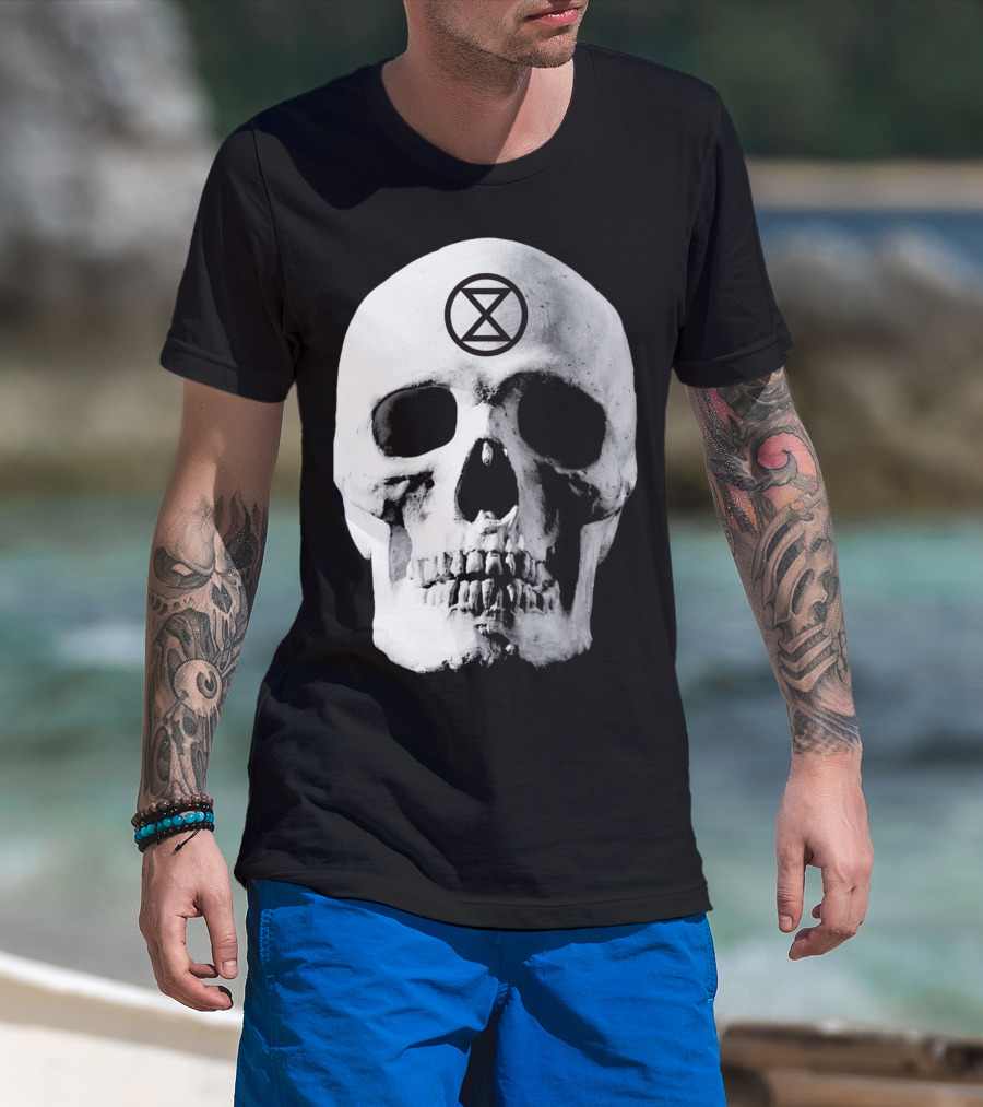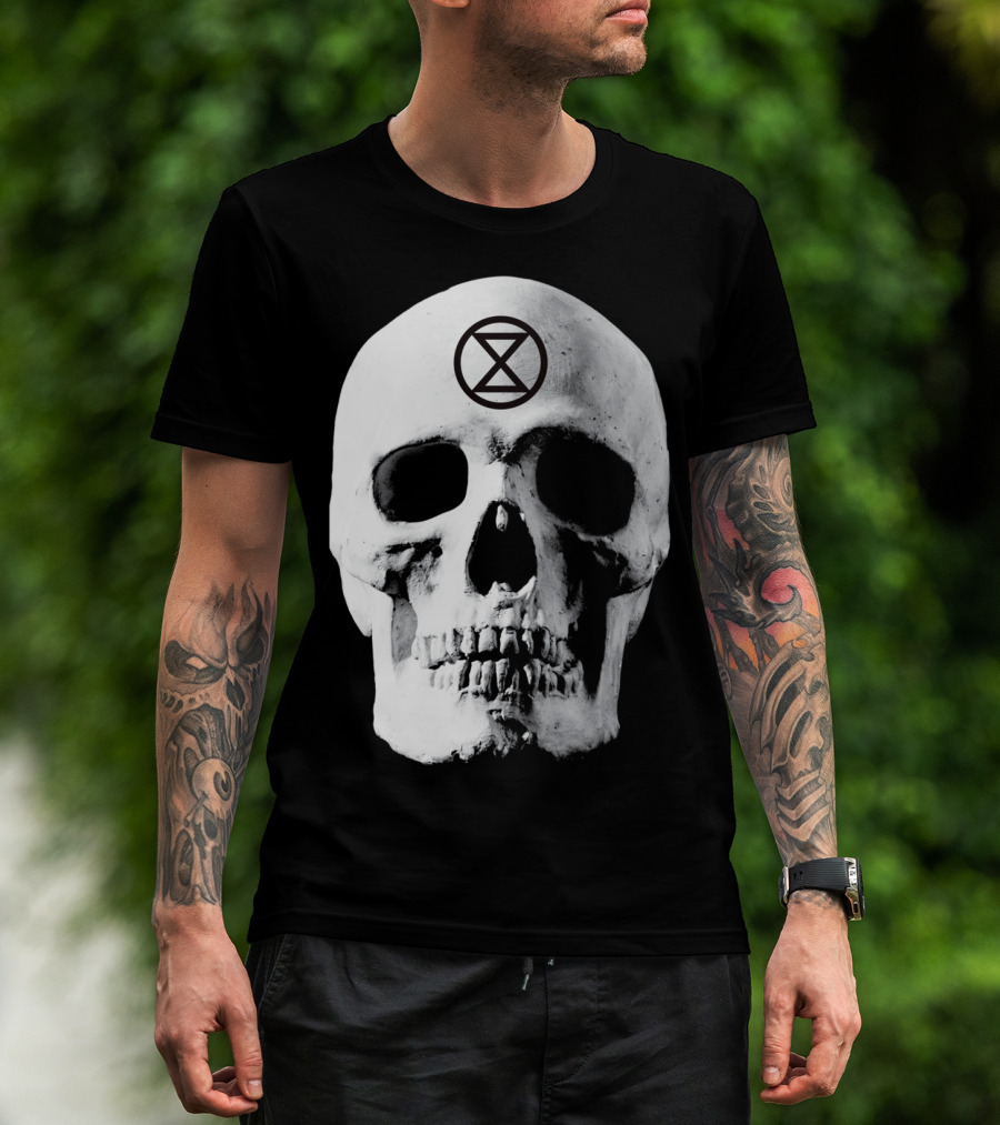Extinction Rebellion Skull With Hourglass Symbol In Deadly Warning T-Shirt