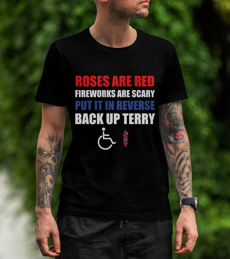 How much will this Roses Are Red Fireworks Are Scary Put It in Reverse Back Up Terry Fireworks Wheelchair shirt shrink?