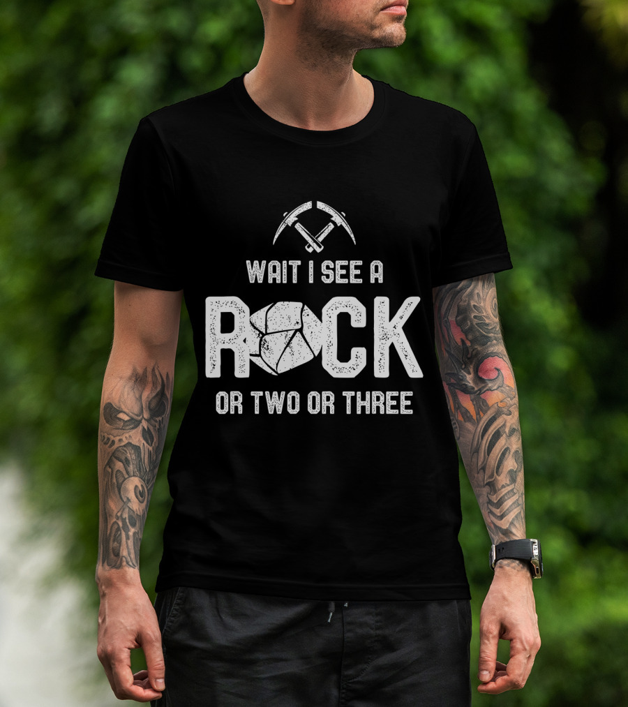 The Wait I See A Rock Or Two Or Three T-shirt is designed for everyday wear and a consistent fit. Fabric is pre-shrunk ring-spun cotton with durable stitching. See the size chart below for exact measurements.