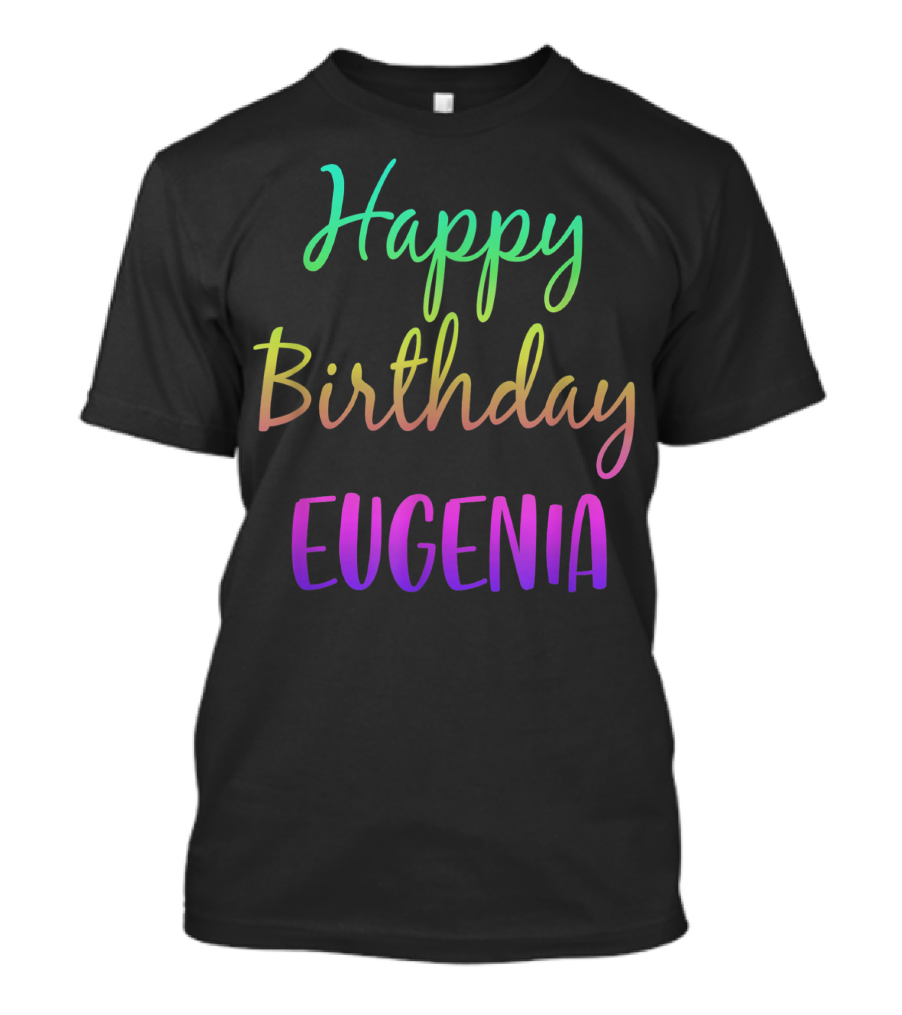 The Happy Birthday Eugenia Gradient Colored Text T-shirt is designed for everyday wear and a consistent fit. Fabric is pre-shrunk ring-spun cotton with durable stitching. See the size chart below for exact measurements.