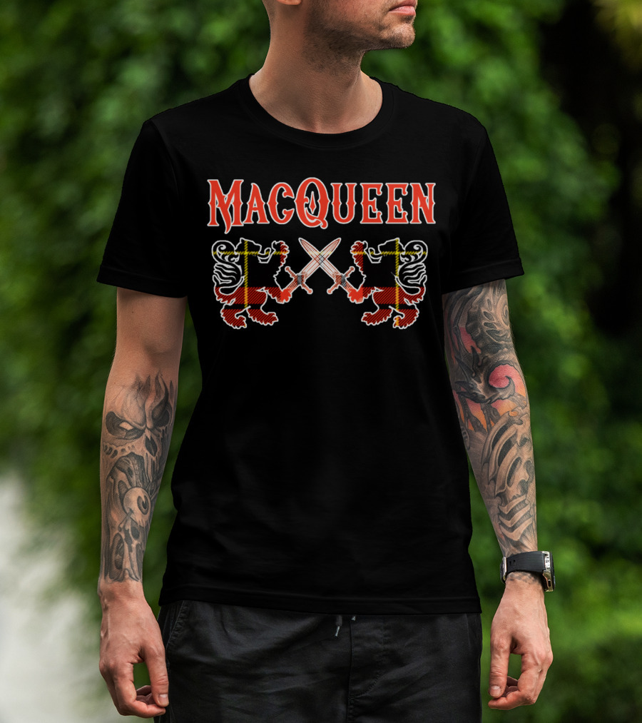 Macqueen Clan Tartan Lion Emblem With Crossed Swords T-Shirt