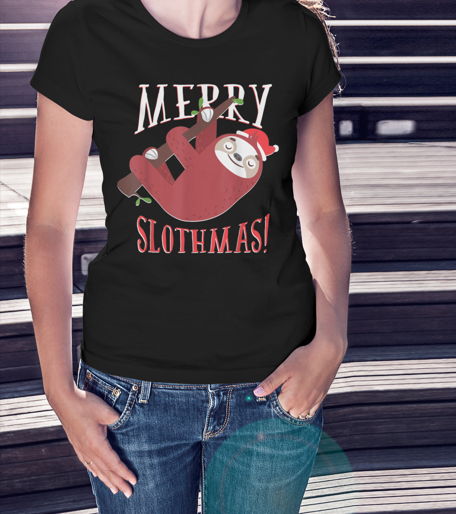 Merry Slothmas Sloth Santa Hat Christmas T-Shirt