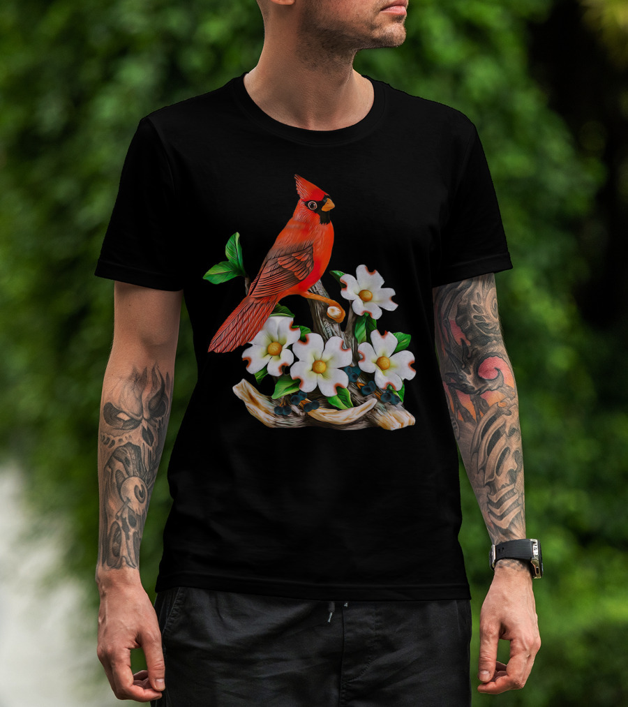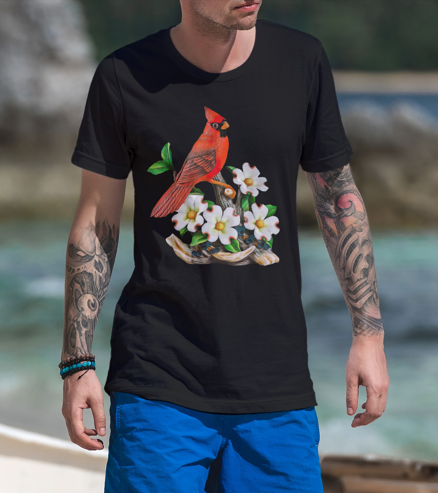 The Red Cardinal Birds with White Flowering Blossoms T-shirt is designed for everyday wear and a consistent fit. Fabric is pre-shrunk ring-spun cotton with durable stitching. See the size chart below for exact measurements.
