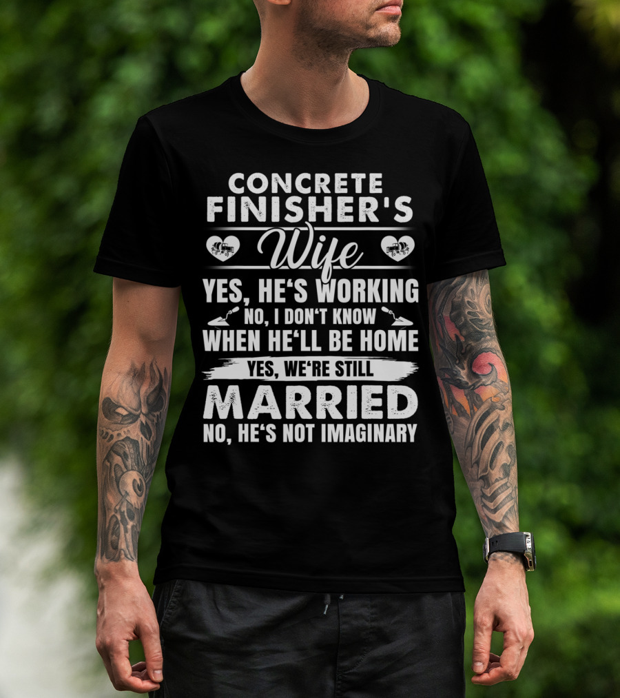 The CONCRETE FINISHER'S WIFE YES HE'S WORKING NO I DON'T KNOW WHEN HE'LL BE HOME YES WE'RE STILL MARRIED NO HE'S NOT IMAGINARY T-shirt is designed for everyday wear and a consistent fit. Fabric is pre-shrunk ring-spun cotton with durable stitching. See the size chart below for exact measurements.