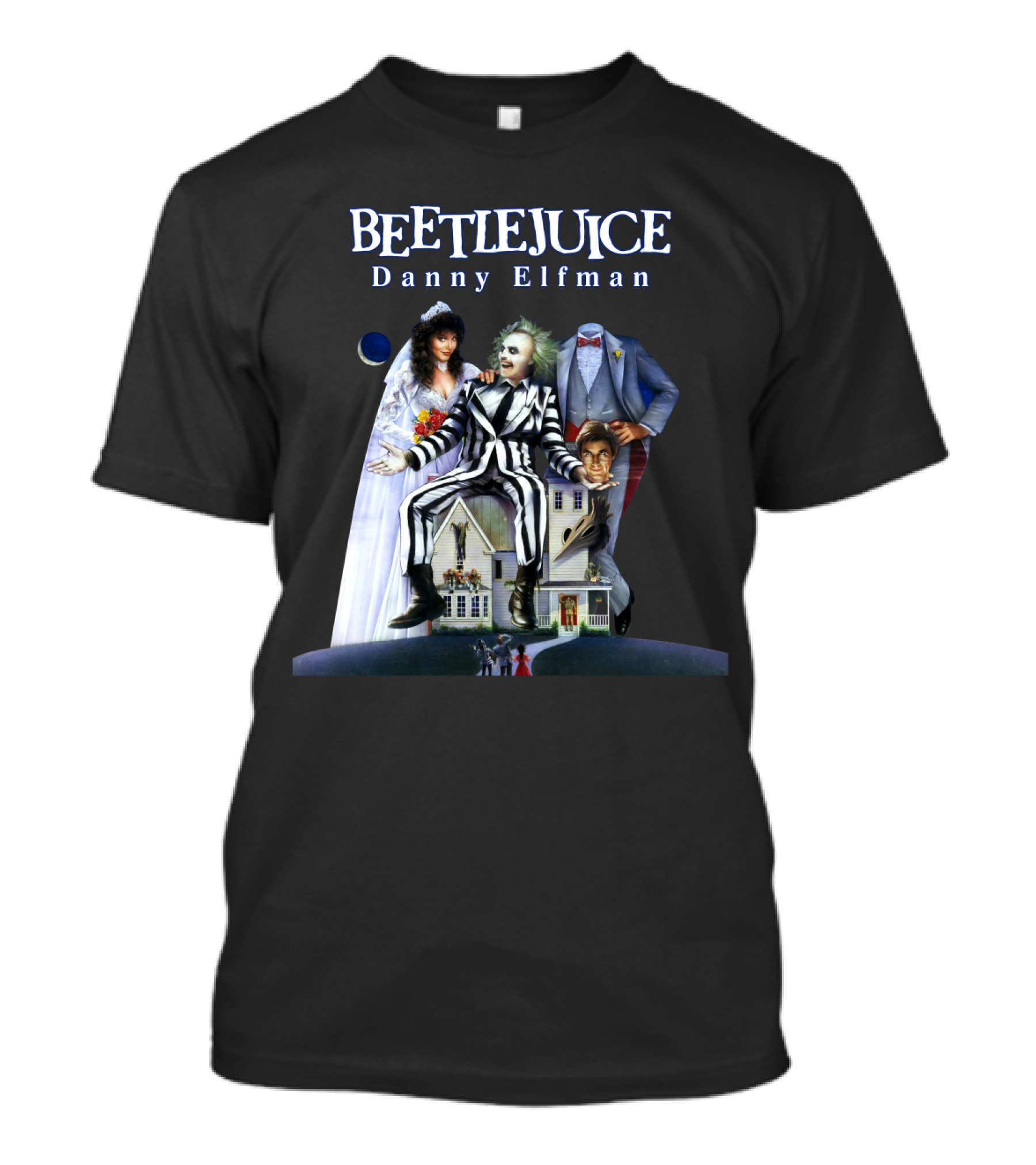 The Beetlejuice Danny Elfman Striped Suit House Wedding Scene T-shirt is designed for everyday wear and a consistent fit. Fabric is pre-shrunk ring-spun cotton with durable stitching. See the size chart below for exact measurements.