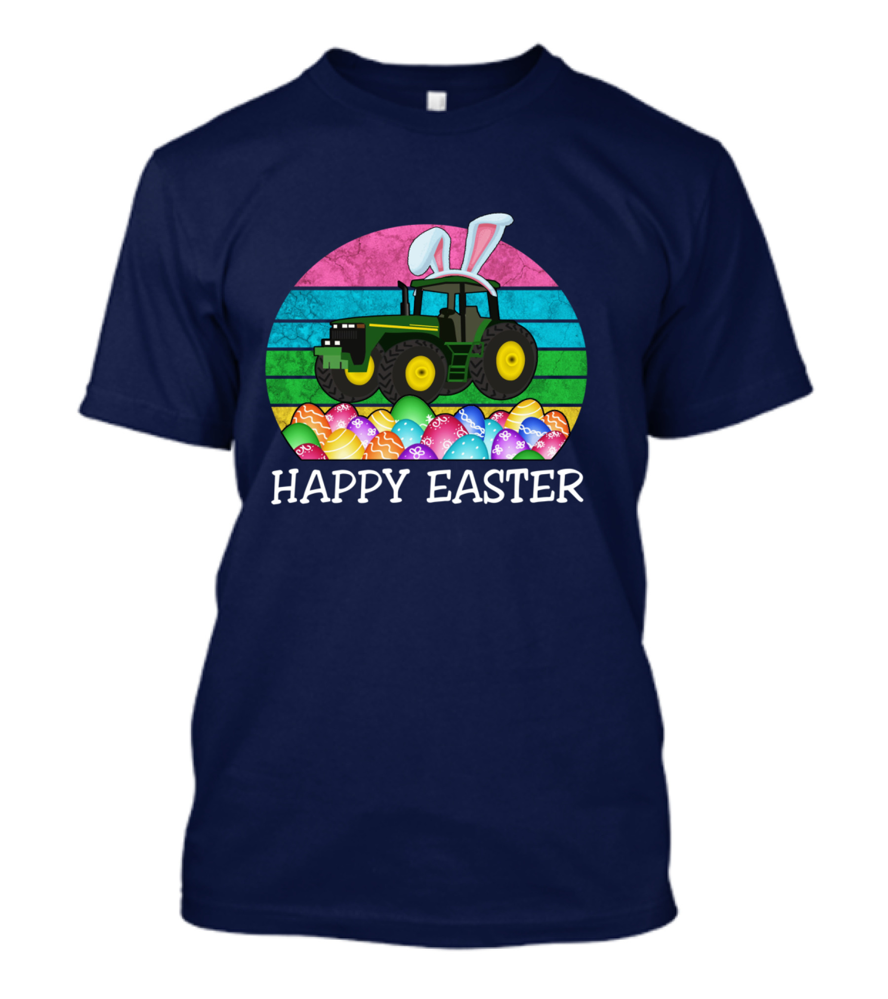 The Happy Easter Vintage Bunny Ears with Tractor and Colorful Eggs T-shirt is designed for everyday wear and a consistent fit. Fabric is pre-shrunk ring-spun cotton with durable stitching. See the size chart below for exact measurements.