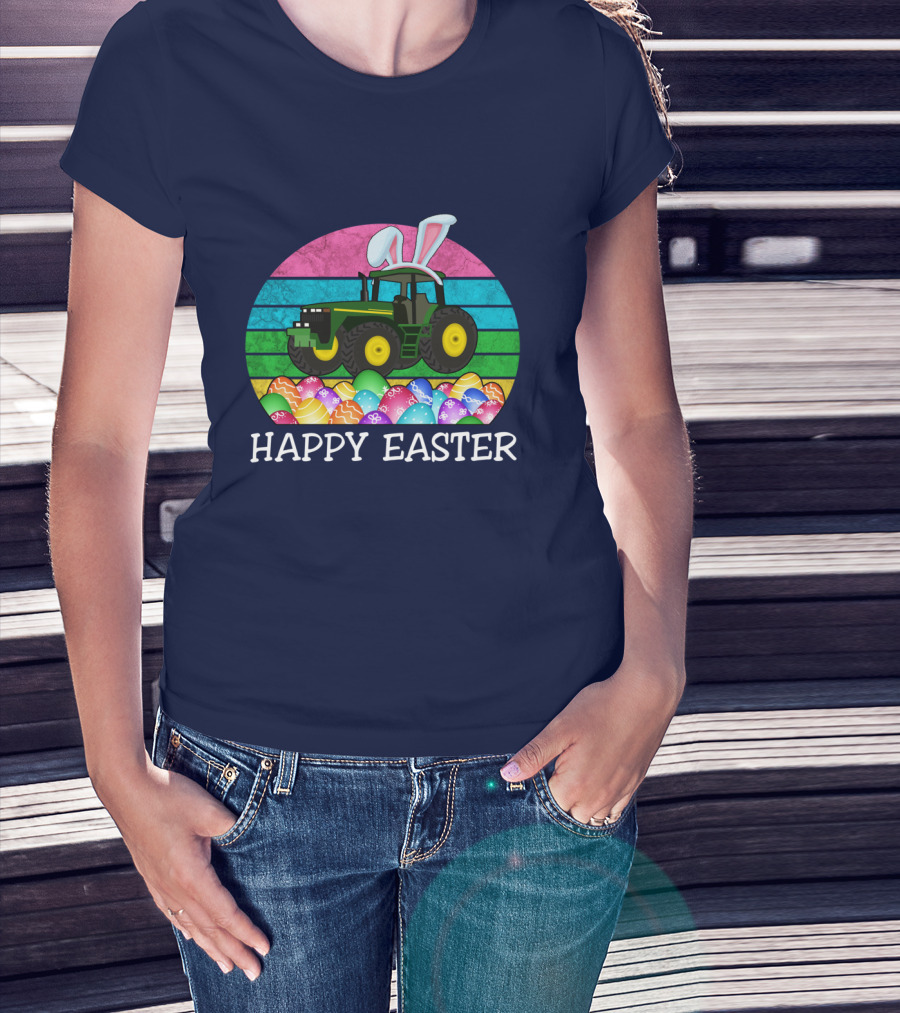 Happy Easter Vintage Bunny Ears With Tractor And Colorful Eggs T-Shirt